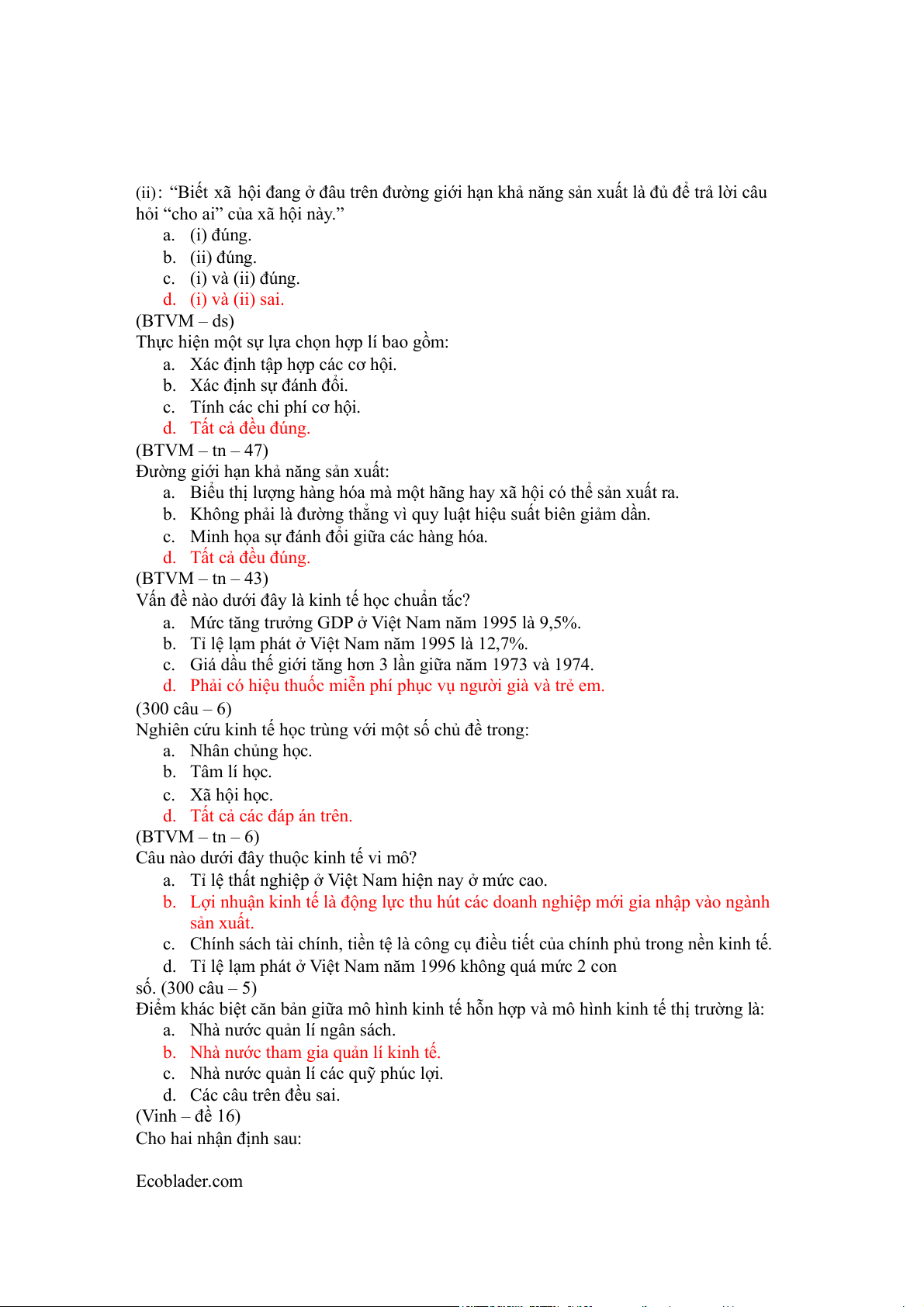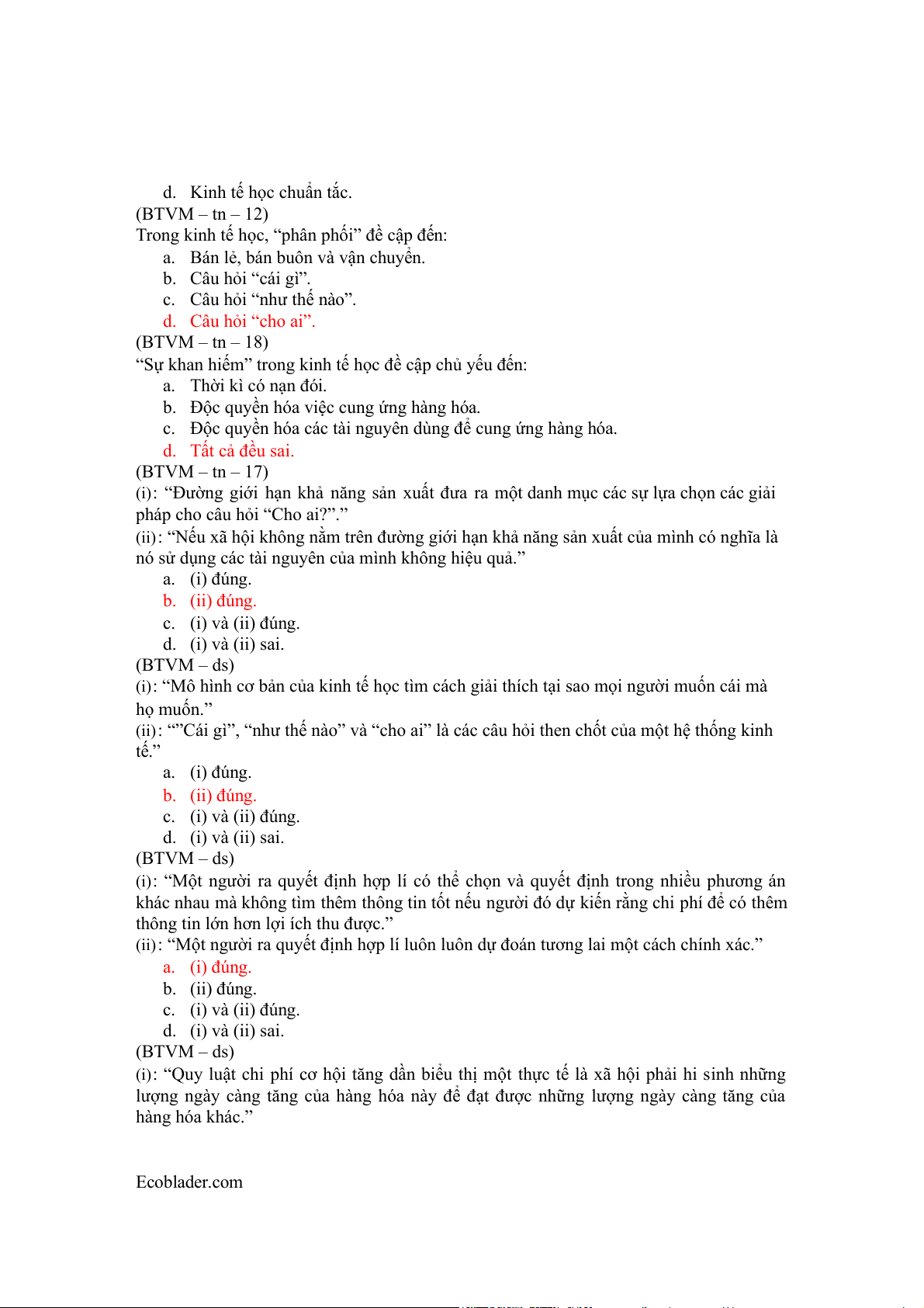 (ii): “”Cái gì”, “như thế nào” và “cho ai” là các câu hỏi then chốt của một hệ thống kinh tế.” a. (i) đúng. b. (ii) đúng. c. (i) và (ii) đúng. d. (i) và (ii) sai. (BTVM – ds)