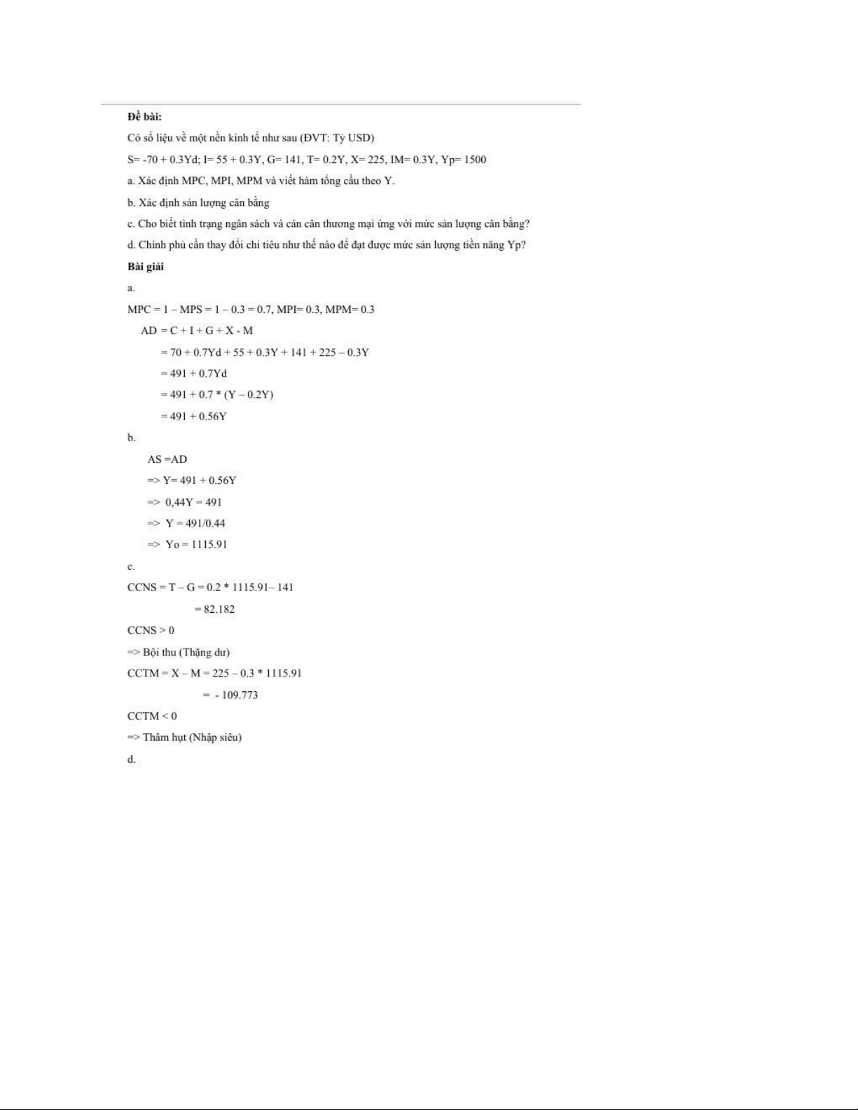 c. Cho biết tình trạng ngân sách và cán cân thương mại ứng với mức sản lượng cân bằng?