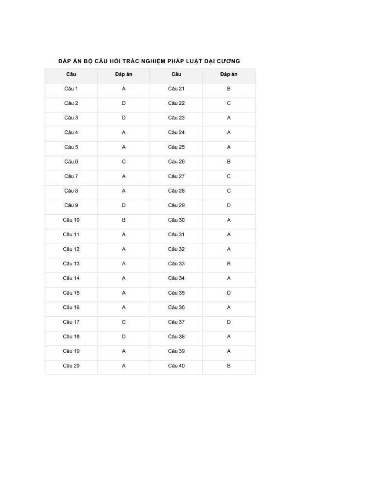 ĐÁP ÁN BỘ CÂU HỎI TRẮC NGHIỆM PHÁP LUẬT ĐẠI CƯƠNG