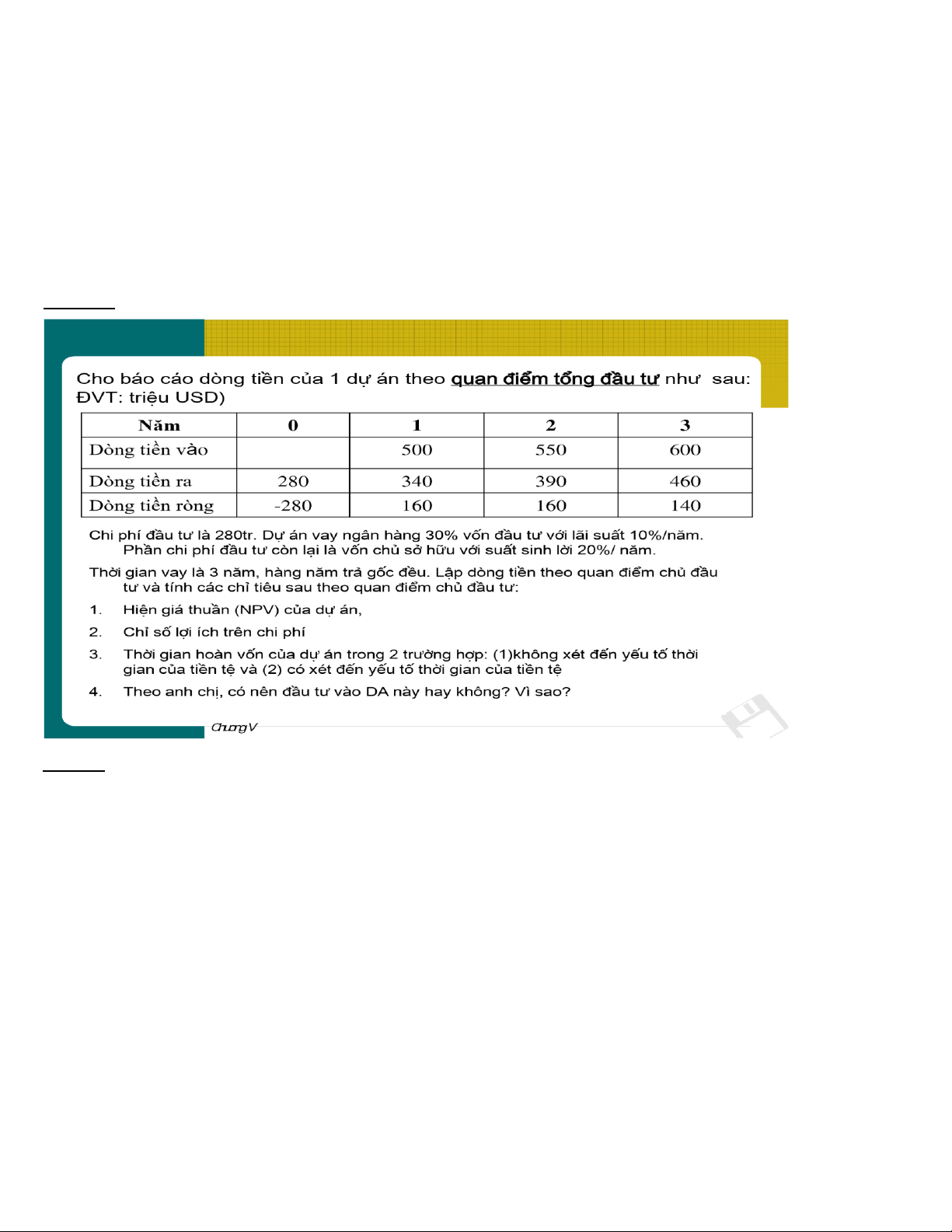 1. Lập báo cáo dòng tiền dự án theo quan iểm tổng ầu tư.