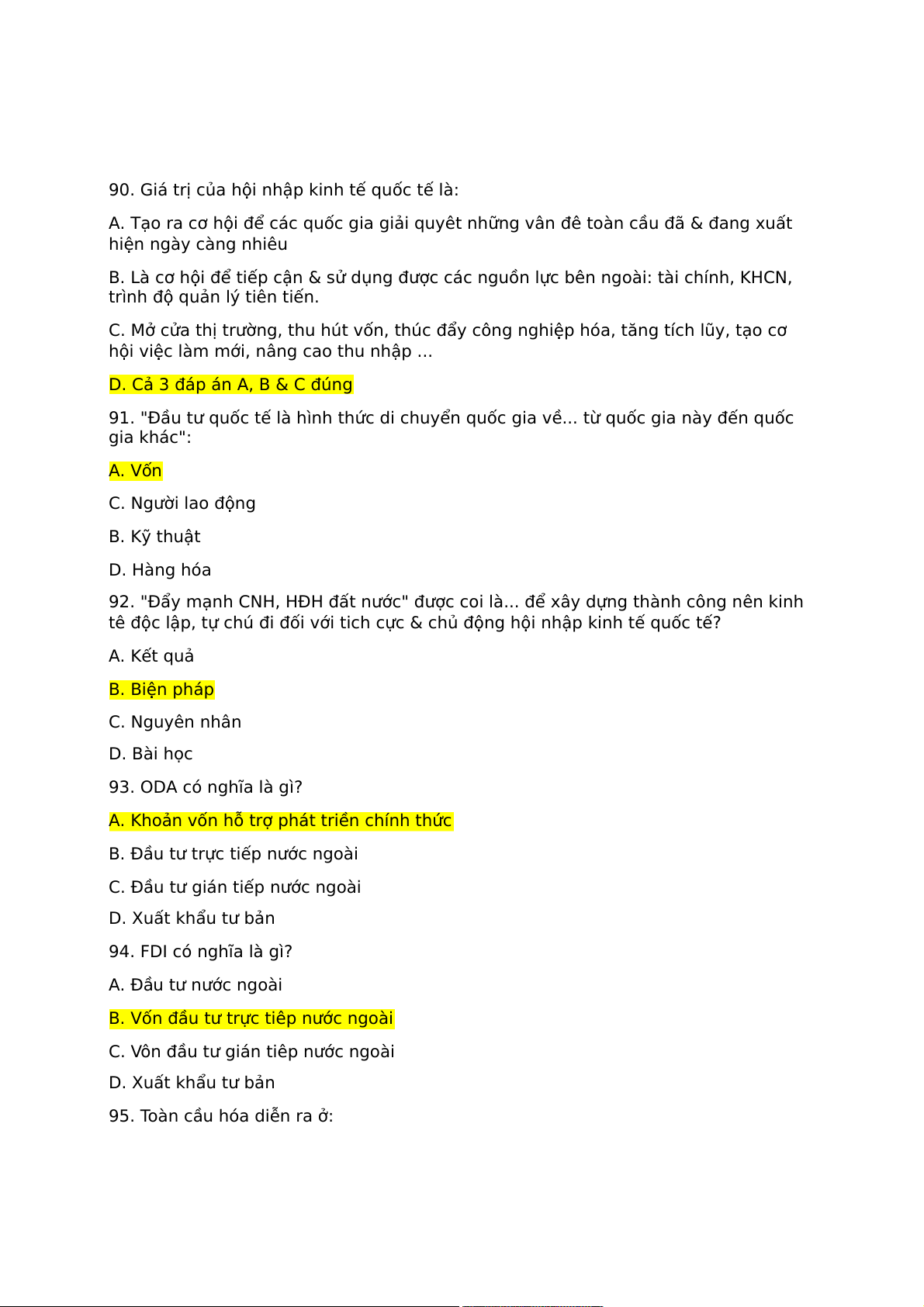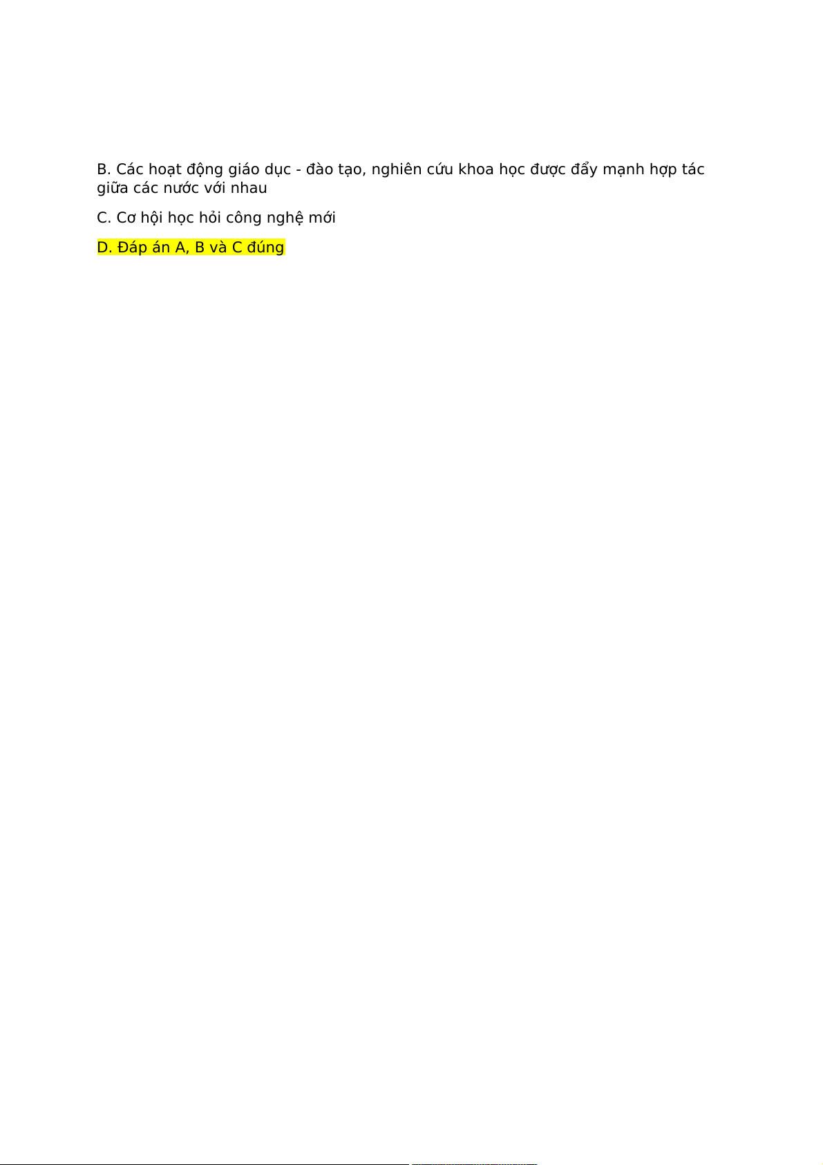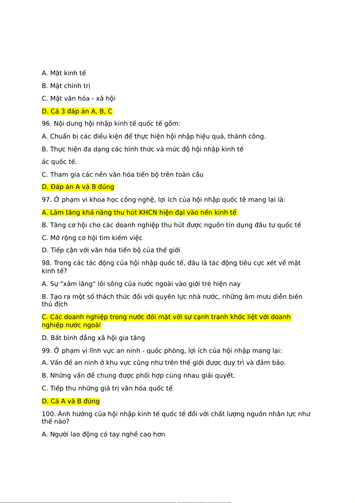 95. Toàn cầu hóa diễn ra ở: A. Mặt kinh tế B. Mặt chính trị C. Mặt văn hóa - xã hội D. Cả 3 đáp án A, B, C