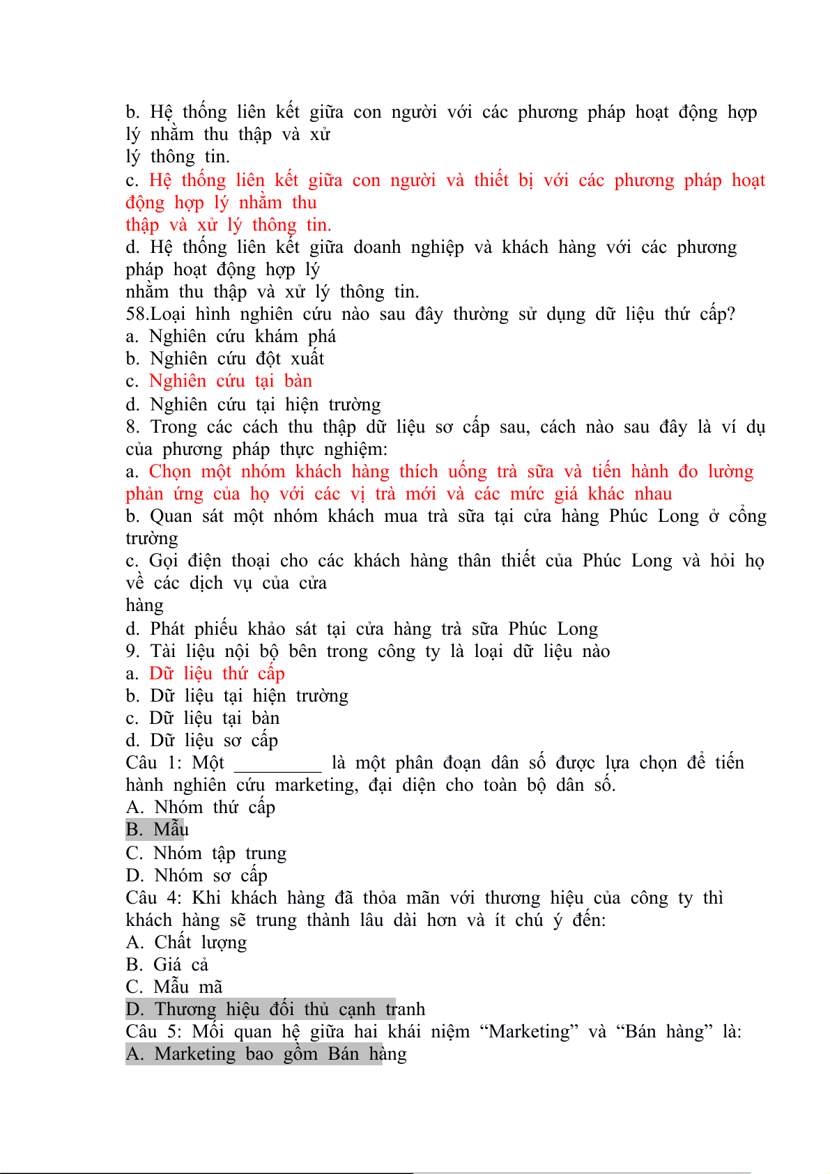 58.Loại hình nghiên cứu nào sau đây thường sử dụng dữ liệu thứ cấp? a. Nghiên cứu khám phá b. Nghiên cứu đột xuất c. Nghiên cứu tại bàn