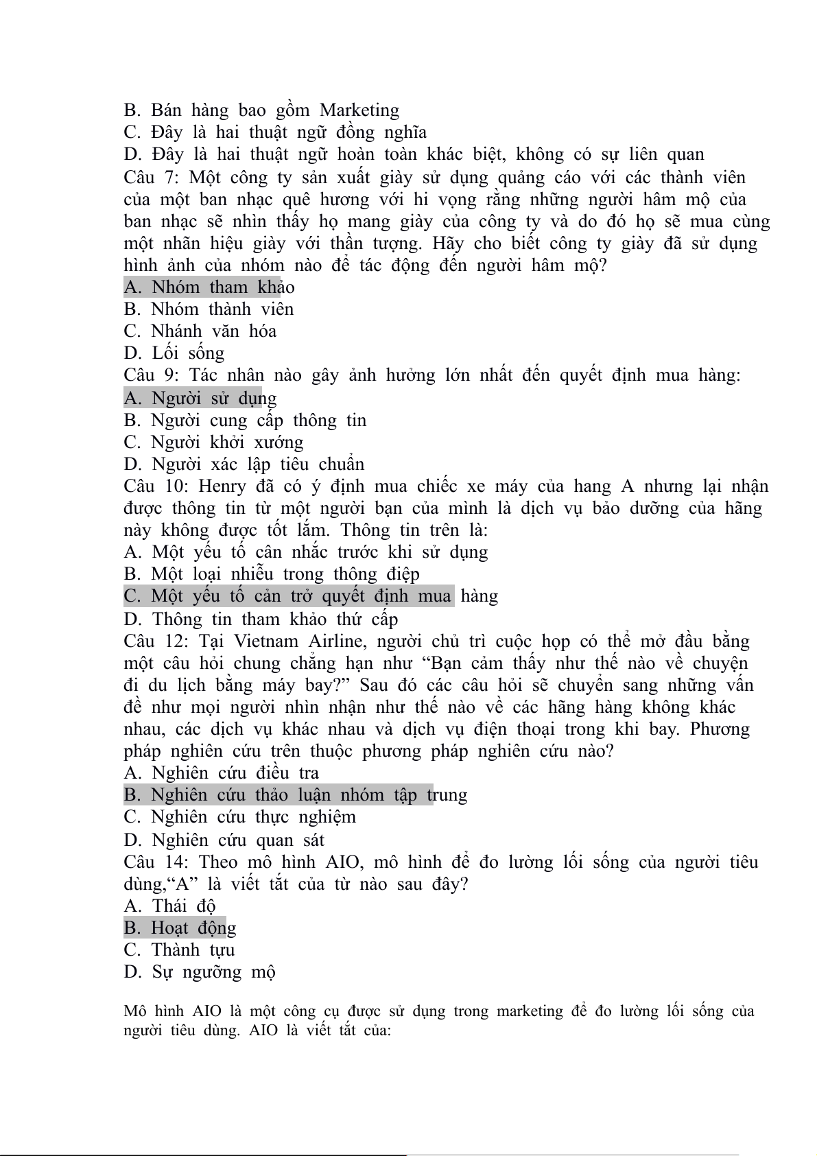 Câu 14: Theo mô hình AIO, mô hình để đo lường lối sống của người tiêu