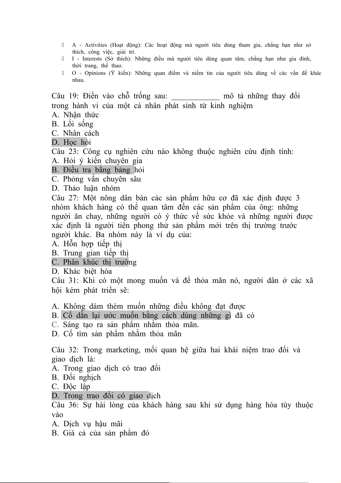 Câu 36: Sự hài lòng của khách hàng sau khi sử dụng hàng hóa tùy thuộc vào A. Dịch vụ hậu mãi
