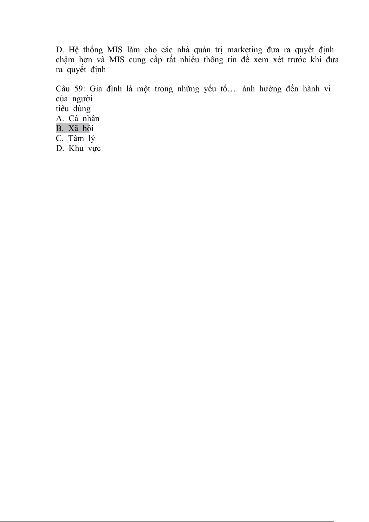 Câu 59: Gia đình là một trong những yếu tố…. ảnh hưởng đến hành vi của người tiêu dùng A. Cá nhân B. Xã hội C. Tâm lý D. Khu vực