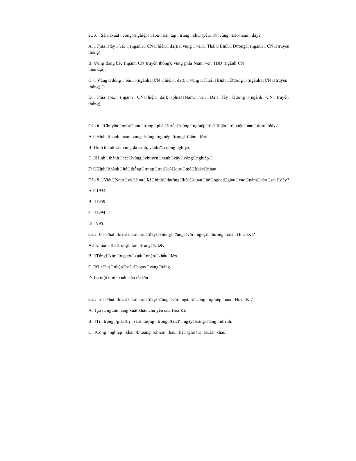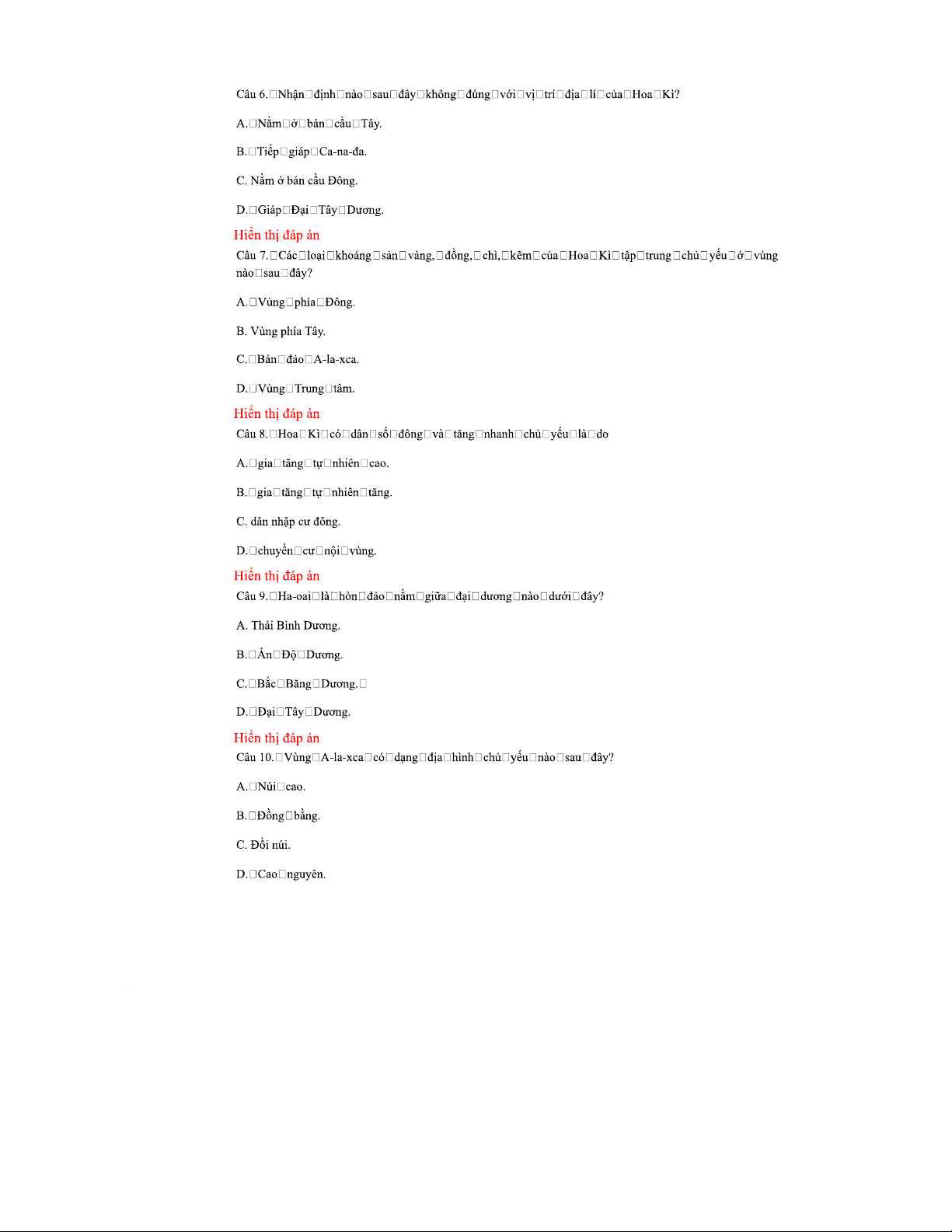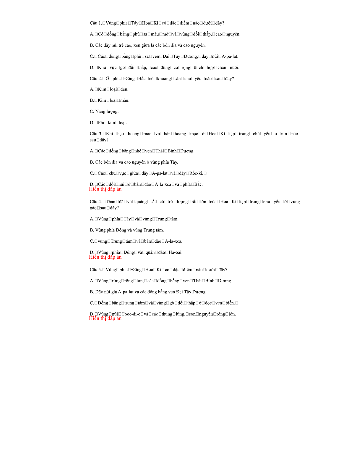 Câu hỏi và đáp án về Địa lý Hoa Kì (Môn: Địa Lý - Giai Đoạn 1)