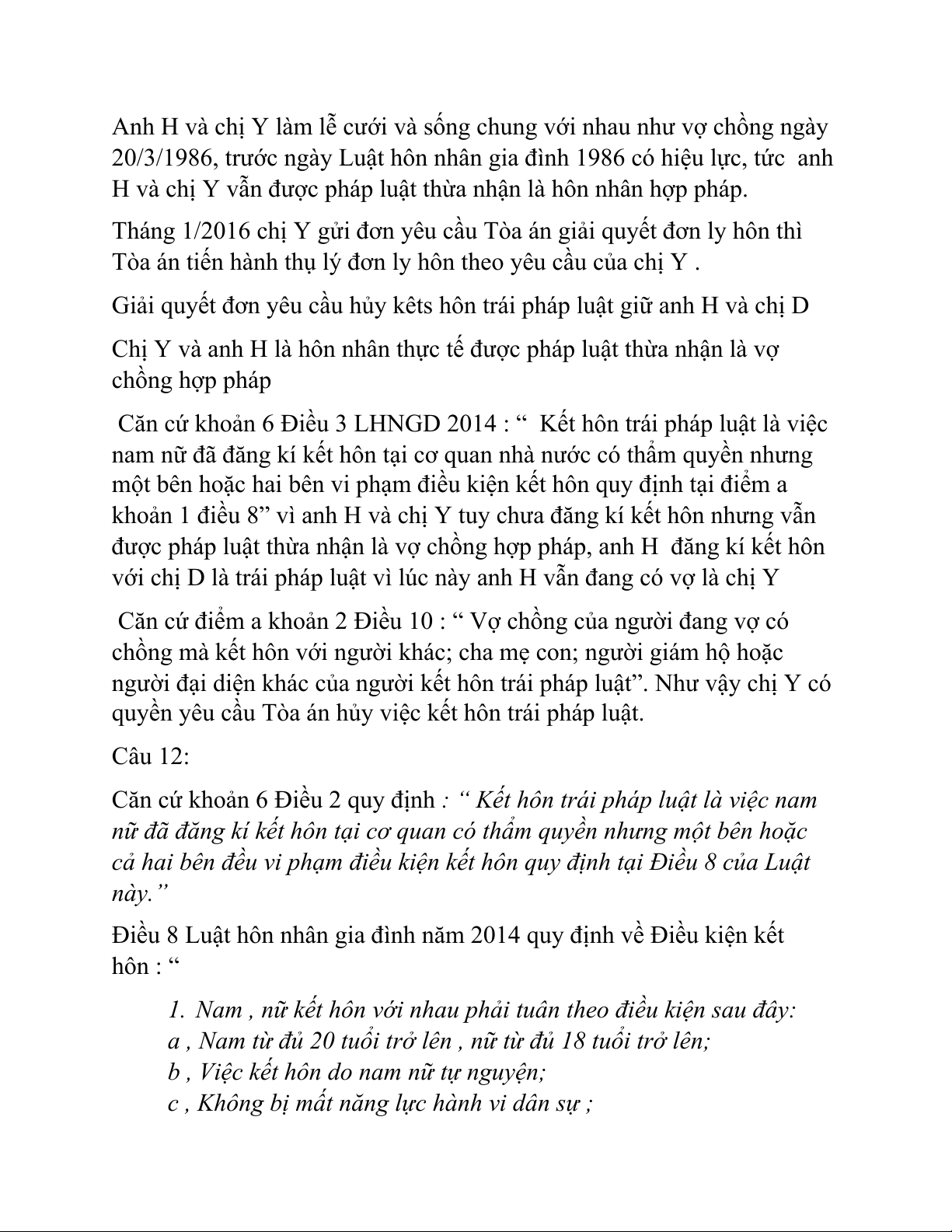 khoản 1 điều 8” vì anh H và chị Y tuy chưa đăng kí kết hôn nhưng vẫn