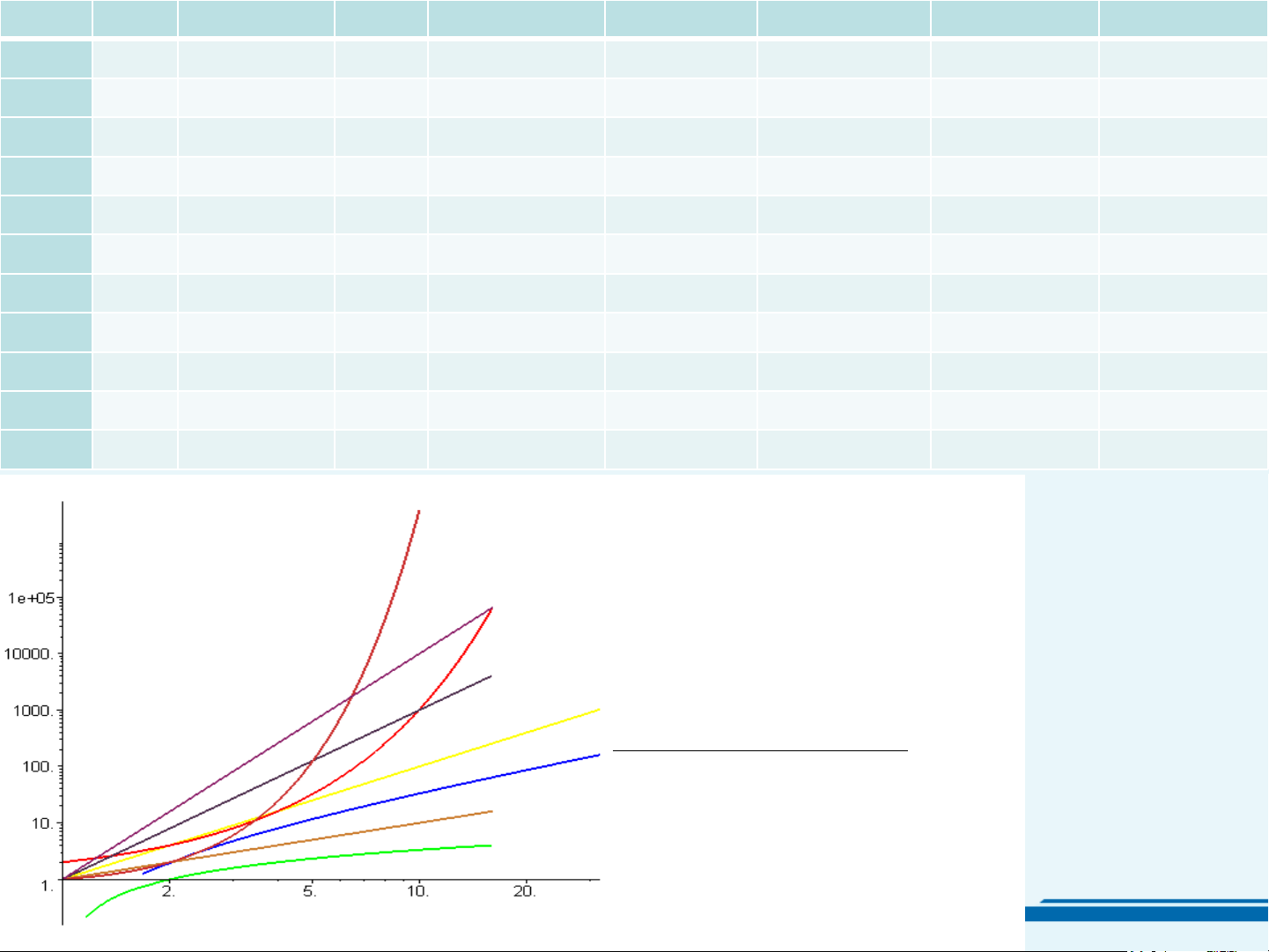 O(1) O(log(n)) O(n) O(nlog(n)) O(n2) O(n3) O(2n) O(n!) 1 1 0 1 0 1 1 2 1 2 1 1 2 2 4 8 4 2 4 1 2 4 8 16 64 16 24 8 1 3 8 24 64 512 256 40320 16 1 4 16 64 256 4096 65536 2.092E+13 32 1 5 32 160 1024 32768 4.29E+09 2.631E+35 64 1 6 64 384 4096 262144 1.84E+19 1.269E+89 128 1 7 128 896 16384 2097152 3.4E+38 3.86E+215 256 1 8 256 2048 65536 16777216 1.16E+77 #NUM! 512 1 9 512 4608 262144 1.34E+08 1.3E+154 #NUM! 1024 1 10 1024 10240 1048576 1.07E+09 #NUM! #NUM! http:/ log(n) color=green /f n color=gold ac ul nlog(n) color=blue ty .juni nhí n2 color=yellow ata.edu/r t p n3 color=violet phé n4 color=purple hodes Số /c s2/c 2n color=red h12a.ht n! color=maroon m 18 Kích thước n