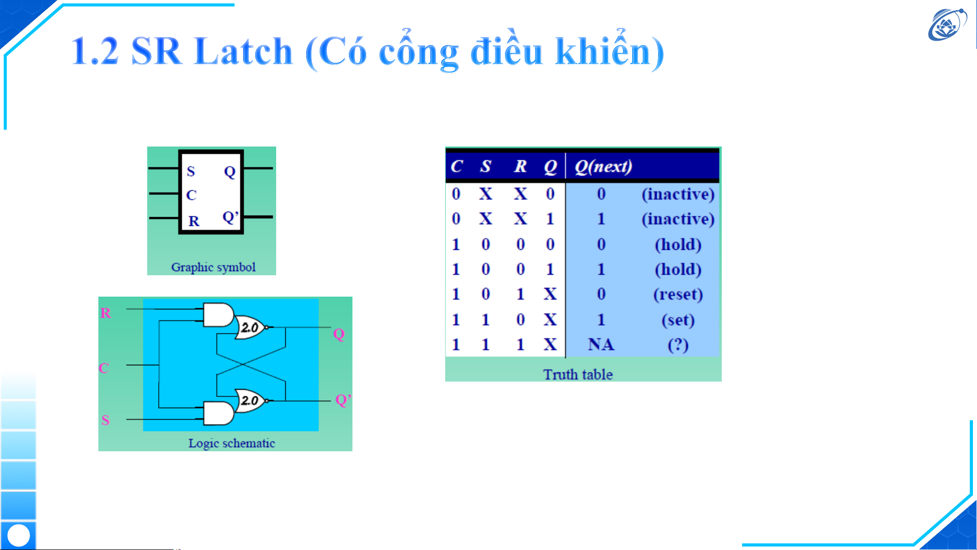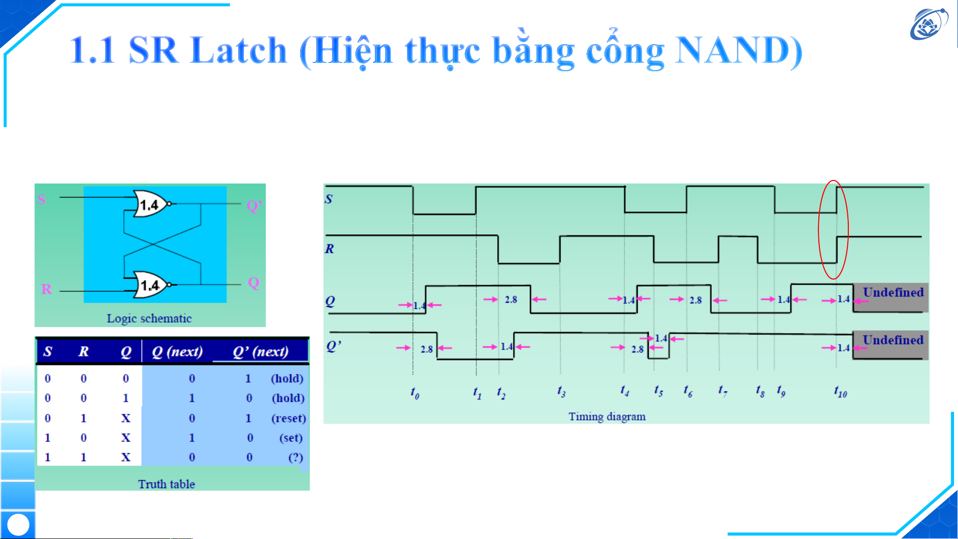 • SR-Latch có hai trạng thái: trạng thái cài đặt (Q=1) và trạng thái đặt lại (Q=0).