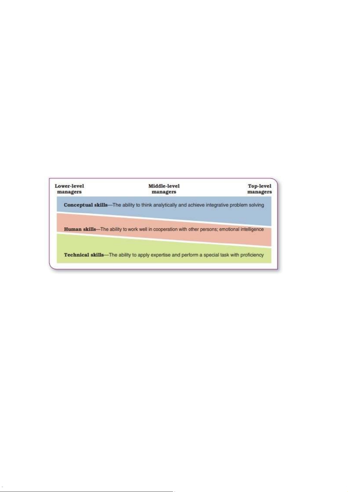 managers cần nhiều nhất conceptual skills, less human skills và least technical skills