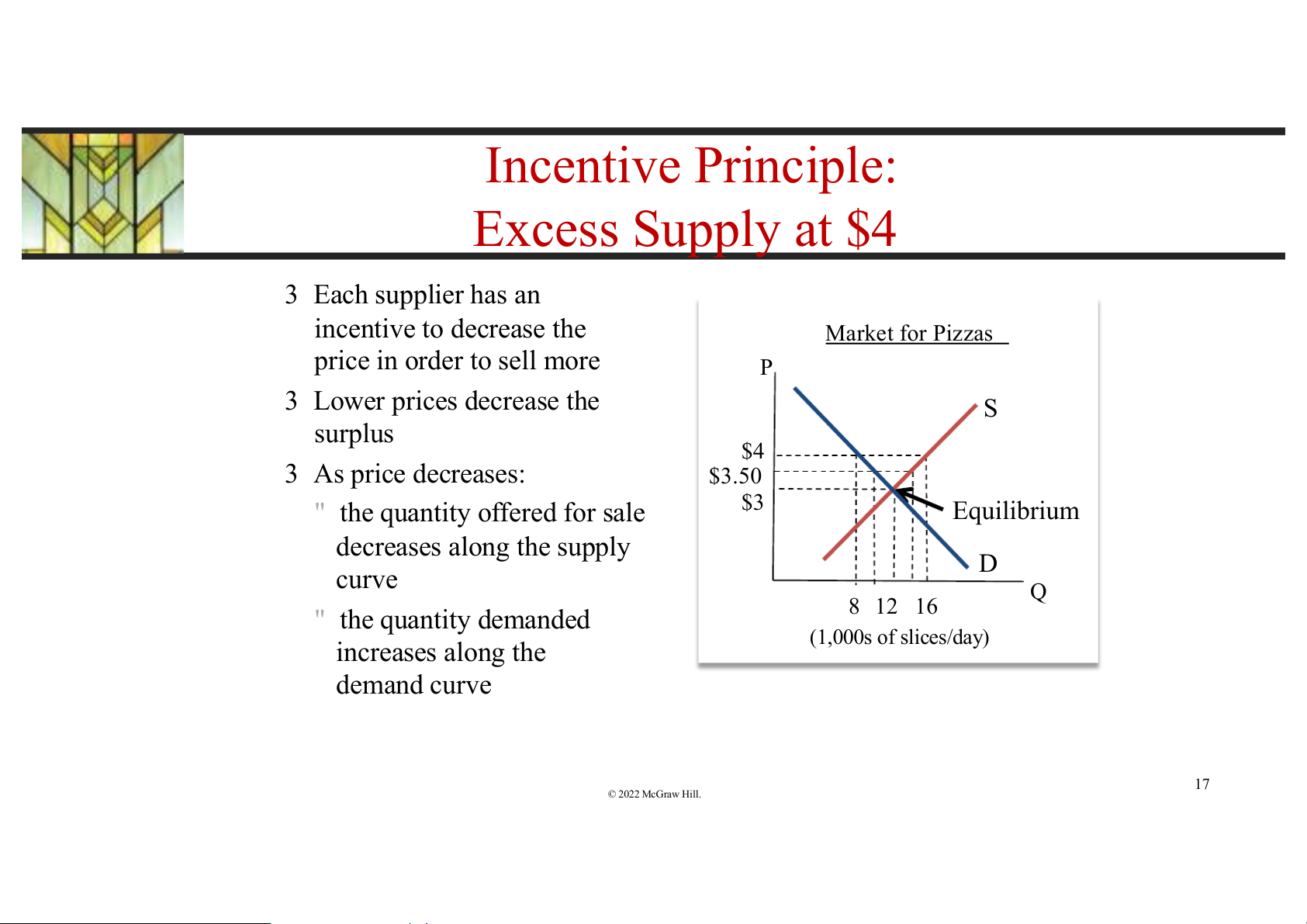 3 At $2, 8,000 slices supplied and 8,000 slices demanded and 16,000 slices demanded Market for Pizzas Market for Pizzas P P Surplus S S $4 Shortage $2 D D Q Q 8 16 8 16 (1,000s of slices/day) (1,000s of slices/day) 16 © 2022 McGraw Hill. Incentive Principle: Excess Supply at $4 3 Each supplier has an incentive to decrease the Market for Pizzas price in order to sell more P 3 Lower prices decrease the S surplus $4 3 As price decreases: $3.50