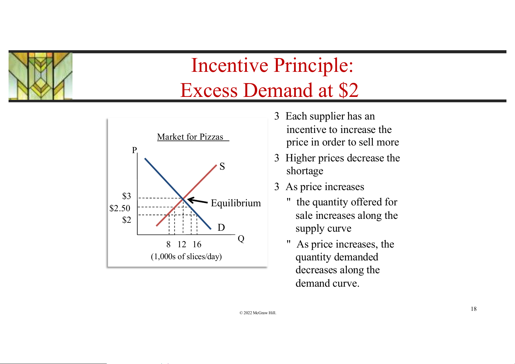" the quantity offered for sale $3 Equilibrium decreases along the supply D curve Q " the quantity demanded 8 12 16 (1,000s of slices/day) increases along the demand curve 17 © 2022 McGraw Hill. Incentive Principle: Excess Demand at $2 3 Each supplier has an incentive to increase the Market for Pizzas price in order to sell more P 3 Higher prices decrease the S shortage 3 As price increases $3 Equilibrium " the quantity offered for $2.50 sale increases along the $2 D supply curve Q 8 12 16 " As price increases, the (1,000s of slices/day) quantity demanded decreases along the demand curve. 18 © 2022 McGraw Hill.