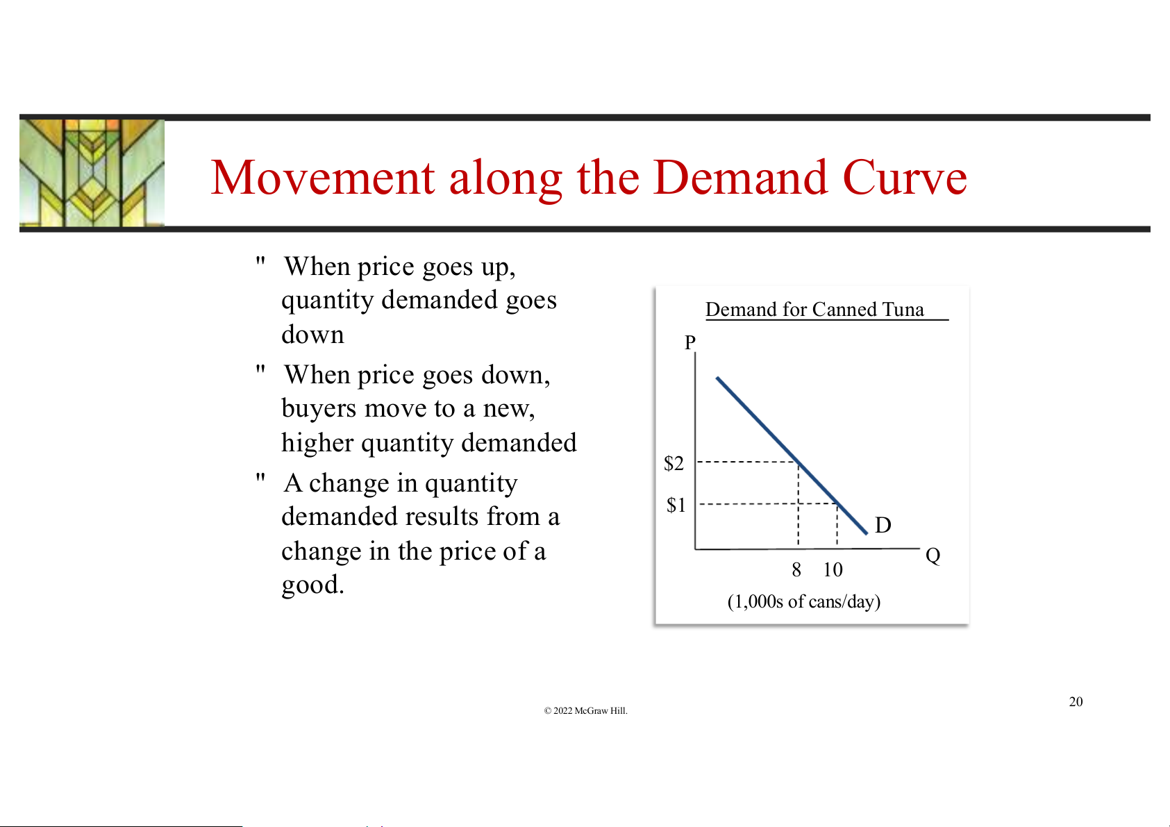 Movement along the Demand Curve " When price goes up, quantity demanded goes Demand for Canned Tuna down P " When price goes down, buyers move to a new, higher quantity demanded $2 " A change in quantity demanded results from a $1 D change in the price of a Q good. 8 10 (1,000s of cans/day) 20 © 2022 McGraw Hill.