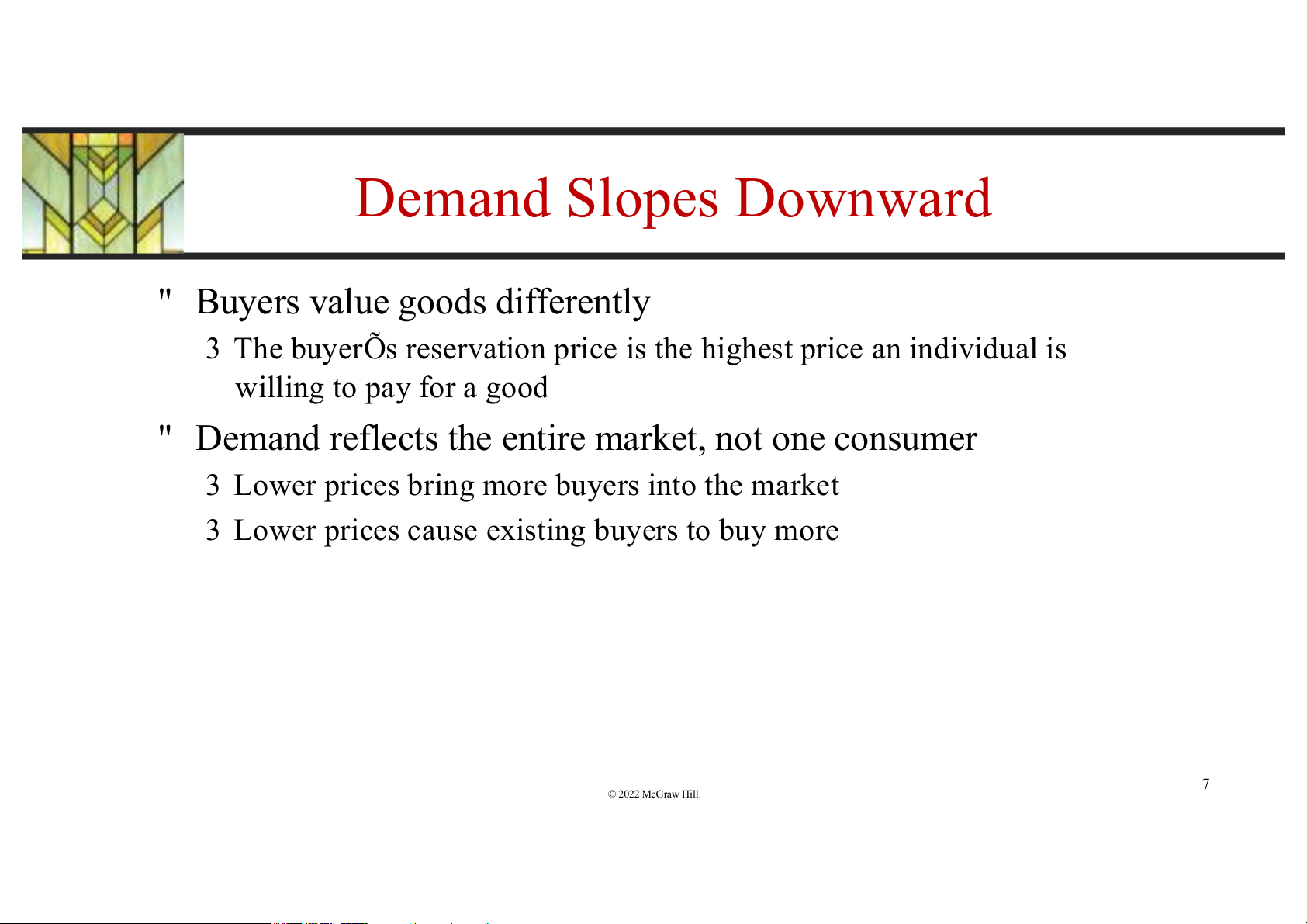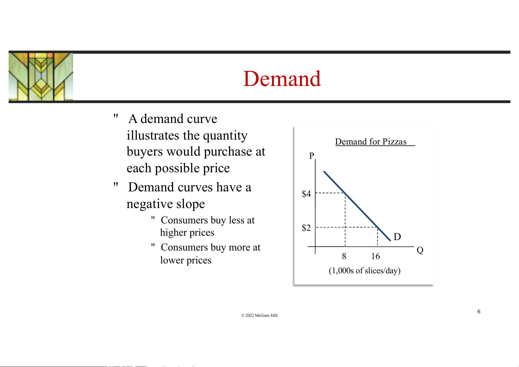 3 Value buyers derive from the good 3 Cost to produce the good 5 © 2022 McGraw Hill. Demand " A demand curve illustrates the quantity Demand for Pizzas buyers would purchase at P each possible price " Demand curves have a $4 negative slope " Consumers buy less at higher prices $2 D " Consumers buy more at Q lower prices 8 16 (1,000s of slices/day) 6 © 2022 McGraw Hill. Demand Slopes Downward