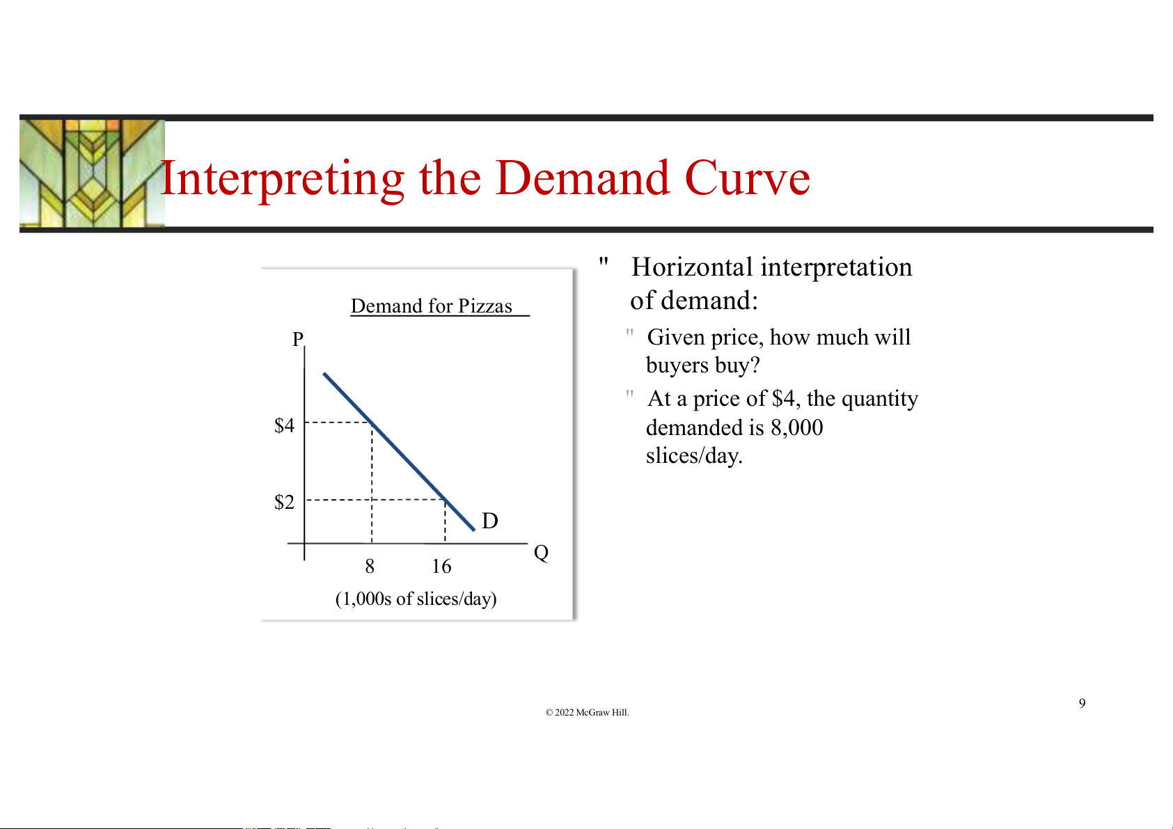 3 The income effect: Buyers' overall purchasing power goes down 8 © 2022 McGraw Hill. Interpreting the Demand Curve " Horizontal interpretation Demand for Pizzas of demand: P " Given price, how much will buyers buy?