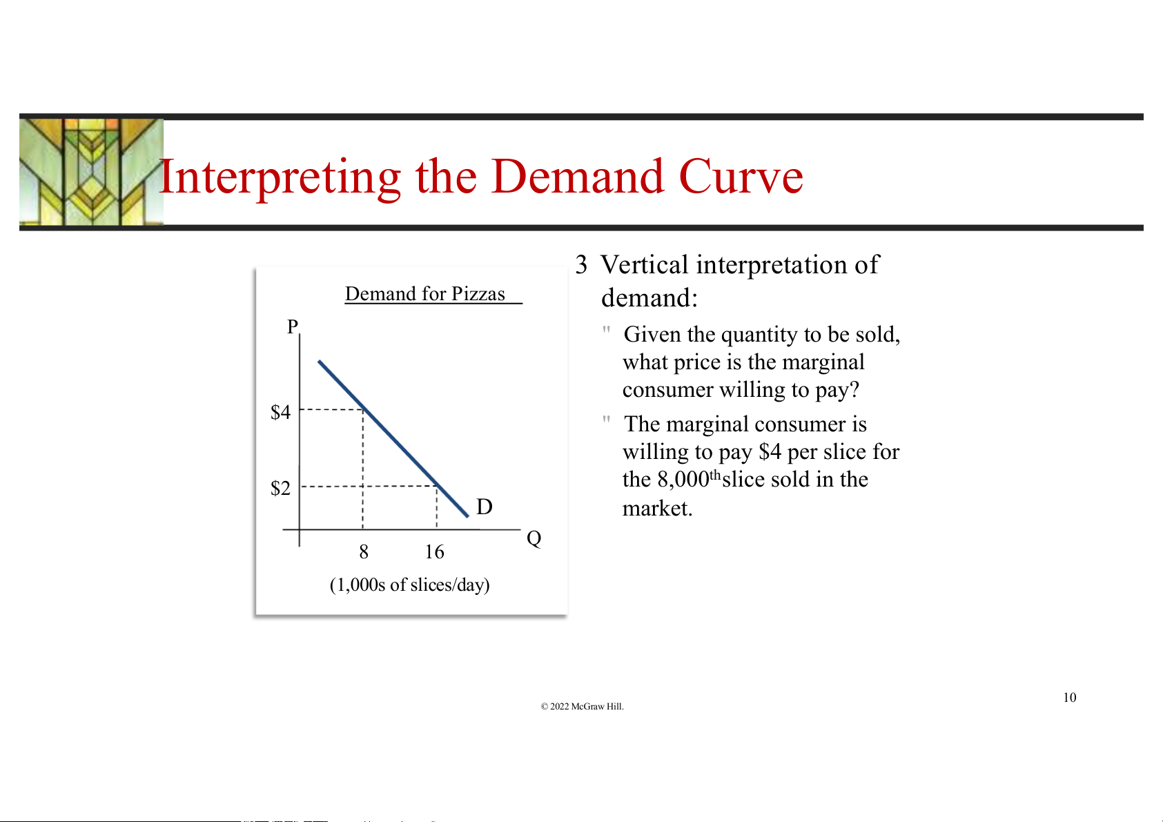 " At a price of $4, the quantity $4 demanded is 8,000 slices/day. $2 D Q 8 16 (1,000s of slices/day) 9 © 2022 McGraw Hill. Interpreting the Demand Curve 3 Vertical interpretation of Demand for Pizzas demand: P