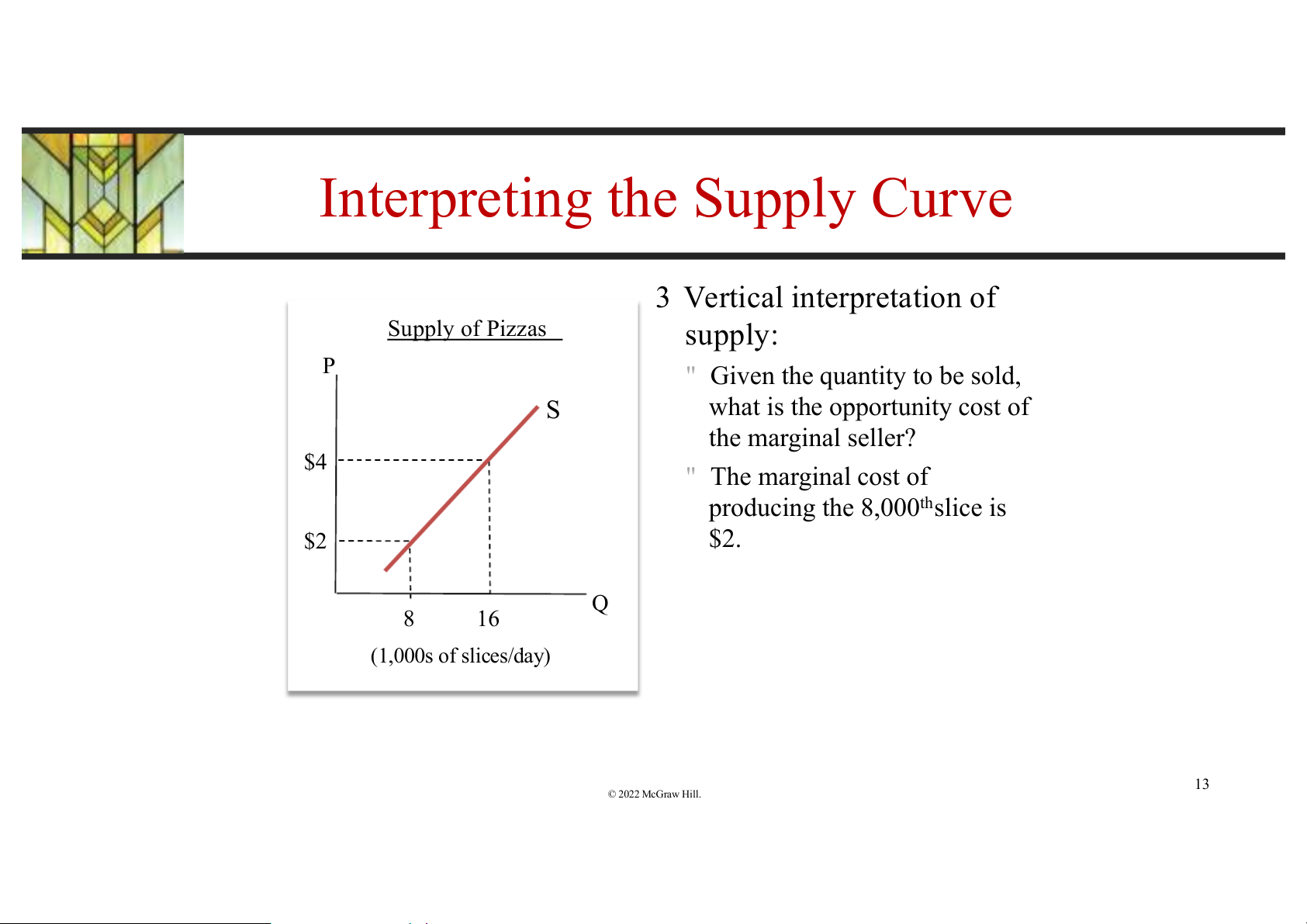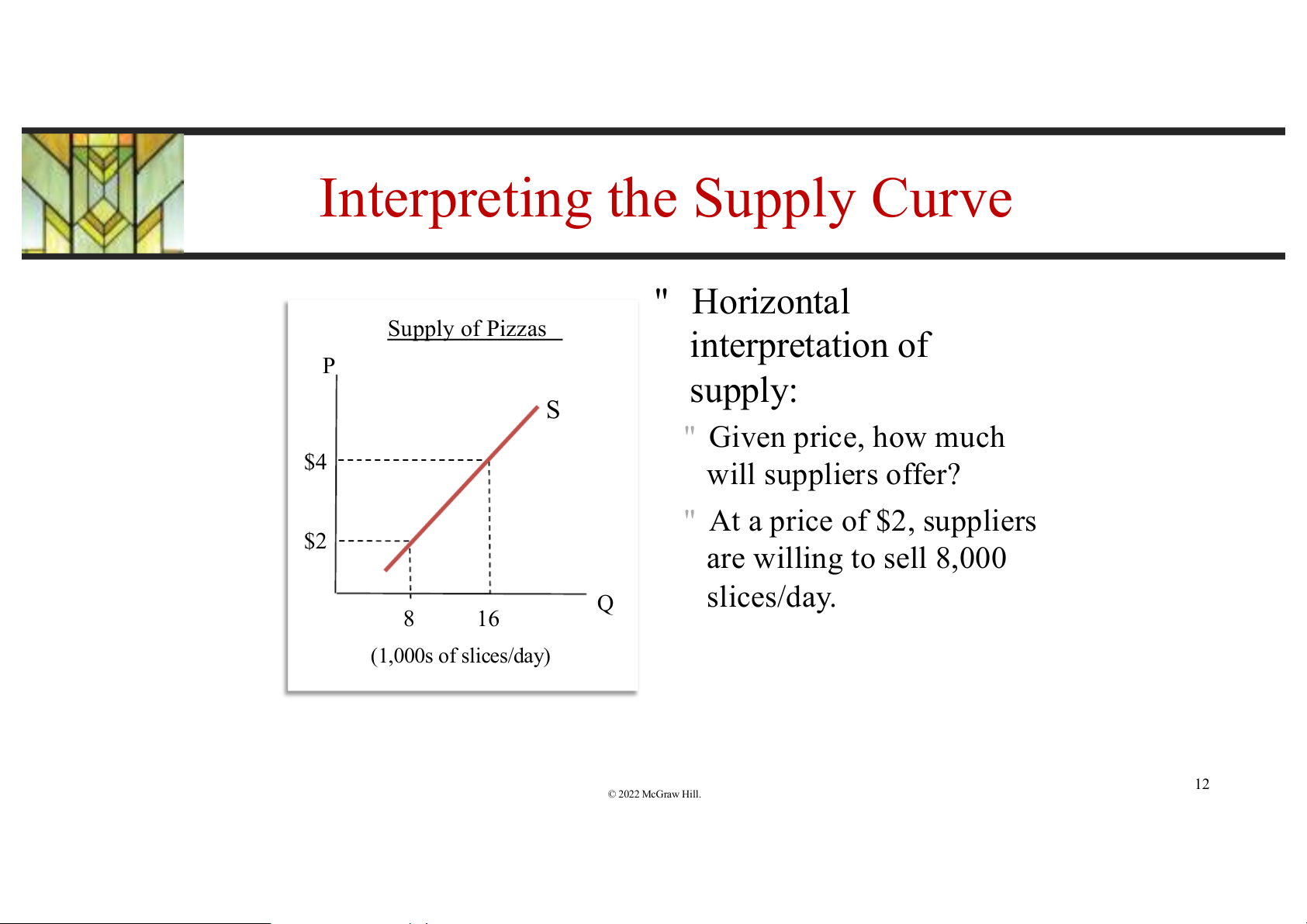" The sellerÕs reservation price is the lowest price the seller would be willing to sell for 3 Equal to marginal cost 11 © 2022 McGraw Hill. Interpreting the Supply Curve " Horizontal Supply of Pizzas interpretation of P supply: S " Given price, how much $4 will suppliers offer? " At a price of $2, suppliers $2 are willing to sell 8,000 Q slices/day. 8 16 (1,000s of slices/day) 12 © 2022 McGraw Hill. Interpreting the Supply Curve 3 Vertical interpretation of Supply of Pizzas supply: P