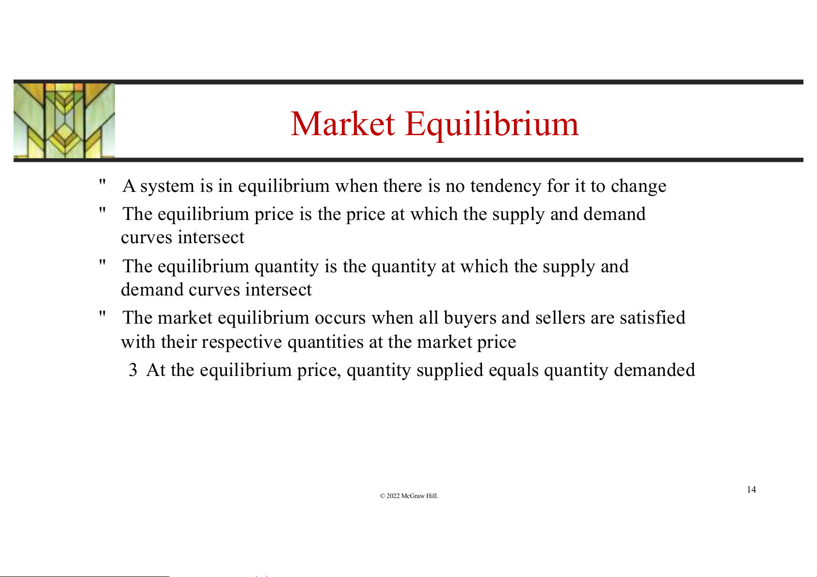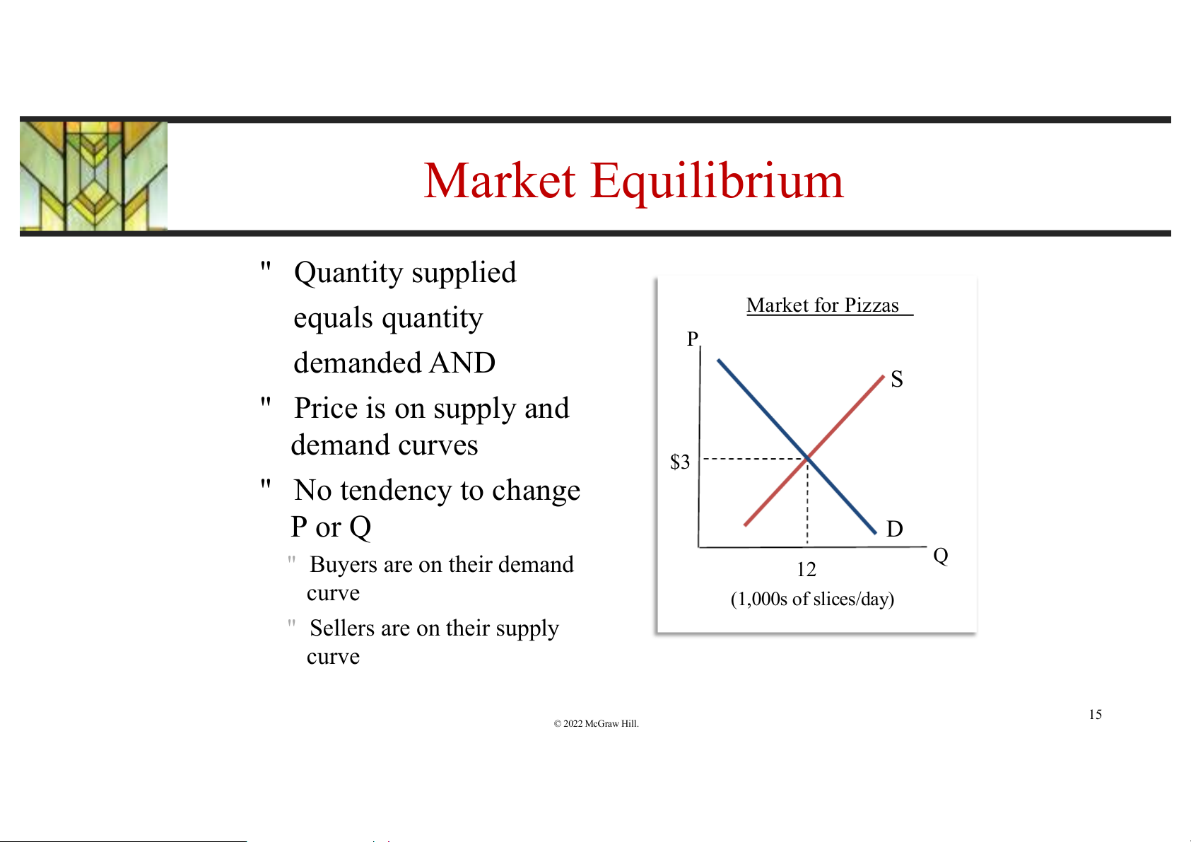 3 At the equilibrium price, quantity supplied equals quantity demanded 14 © 2022 McGraw Hill. Market Equilibrium " Quantity supplied equals quantity Market for Pizzas P demanded AND S " Price is on supply and demand curves $3 " No tendency to change P or Q D " Buyers are on their demand Q 12 curve (1,000s of slices/day) " Sellers are on their supply curve 15 © 2022 McGraw Hill.