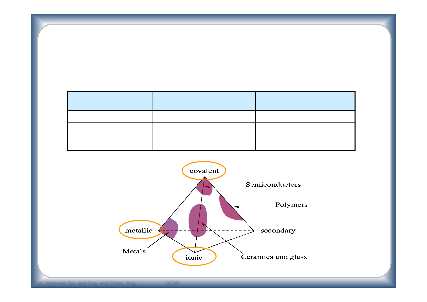 Nature of bonding ↔ properties ↔ type of materials Type of material Character of bonding Examples Metal Metallic Fe, steels Ceramic and glasses Ionic/ covalent Silica (SiO2) Polymers Covalent and secondary Polyethylene –(CH2)-