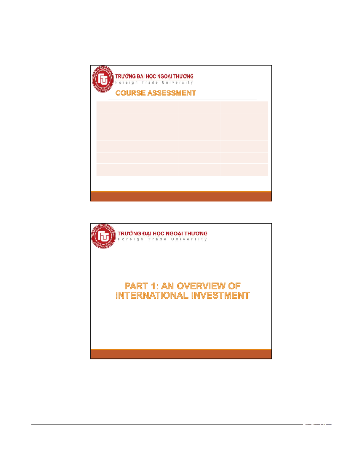 (4) Loc, V. C. (2012). International Investment. Hanoi: NXB Giaoduc. Ths.Nguyễn Hạ Liên Chi 4 2 10/18/2022 Assessment Rate [%] Time allowance Class participation 10% NA Mid-term assessment 30%