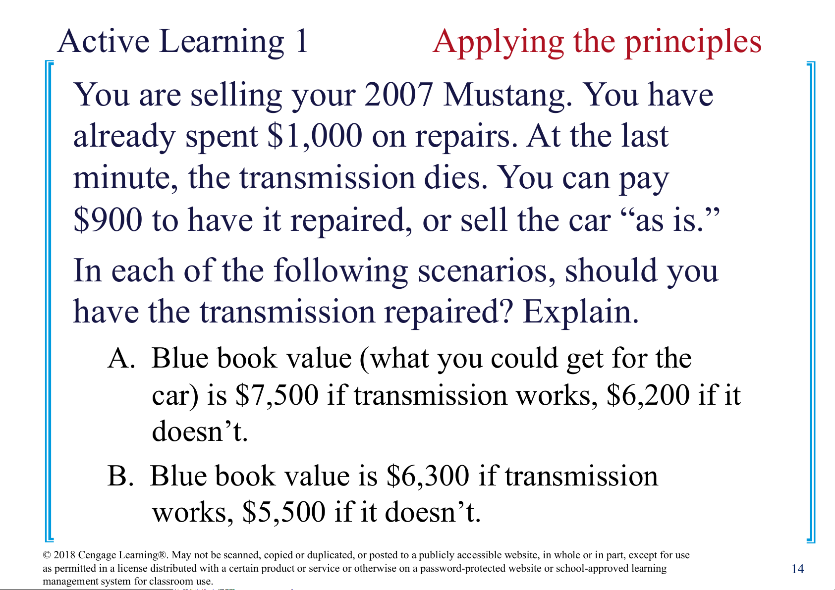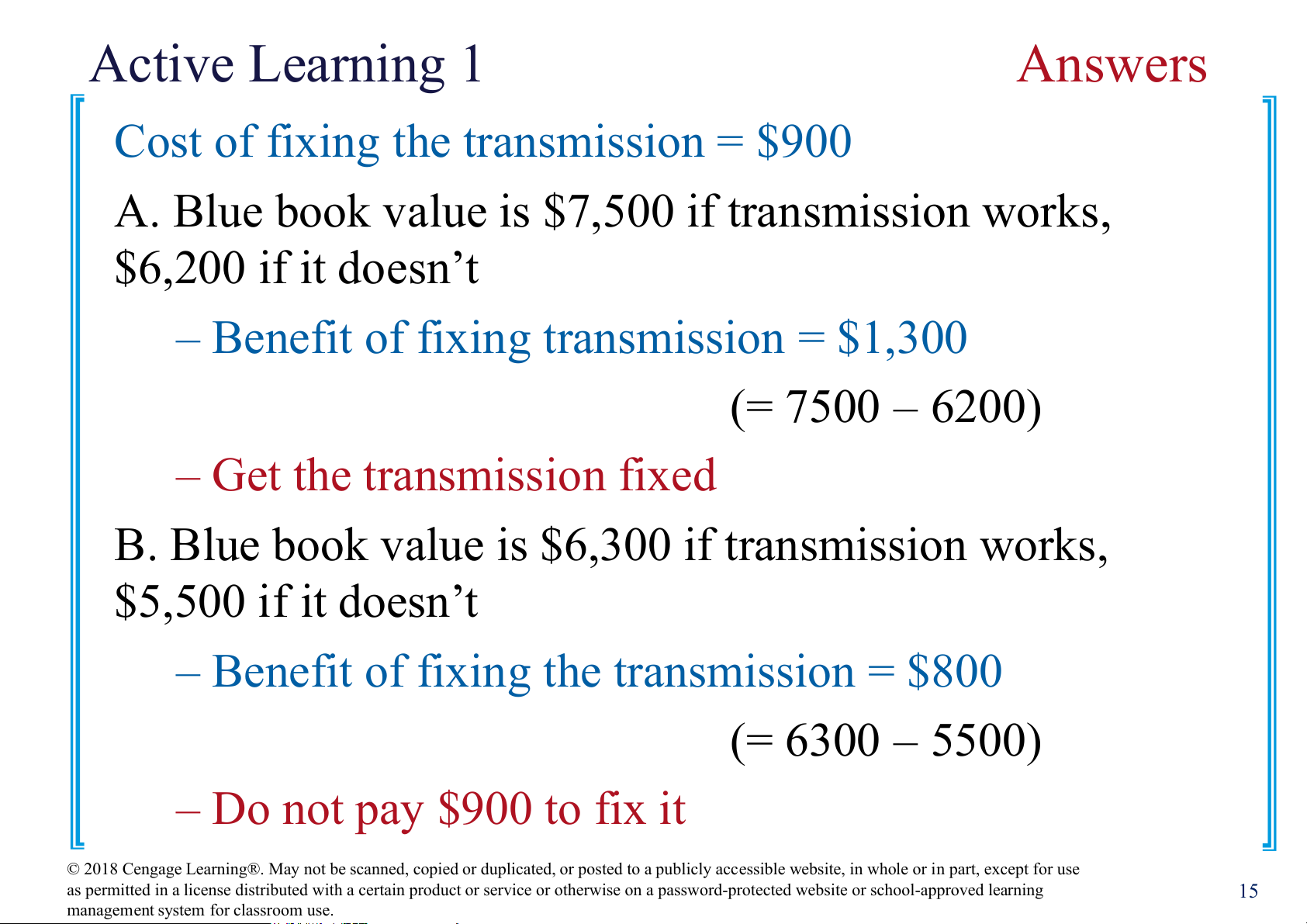 – Benefit of fixing the transmission = $800 (= 6300 – 5500) – Do not pay $900 to fix it