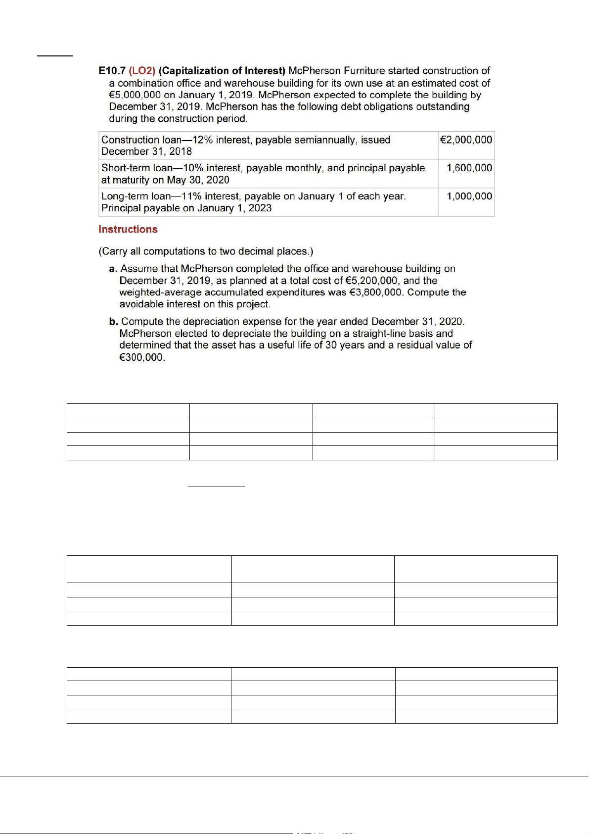 €2,600,000 = 10.38% Avoidable interest Weighted – Average Accumulated Expenditures Interest Rate Avoidable Interest €2,000,000 12% €240,000 €1,800,000 10.38% €186,840 €3,800,000 €426,840 b. Actual Interest Construction loan €2,000,000 x 12% €240,000 Short – term loan €1,600,000 x 10% €160,000 Long – term loan €1,000,000 x 11% €110,000 Total €510,000