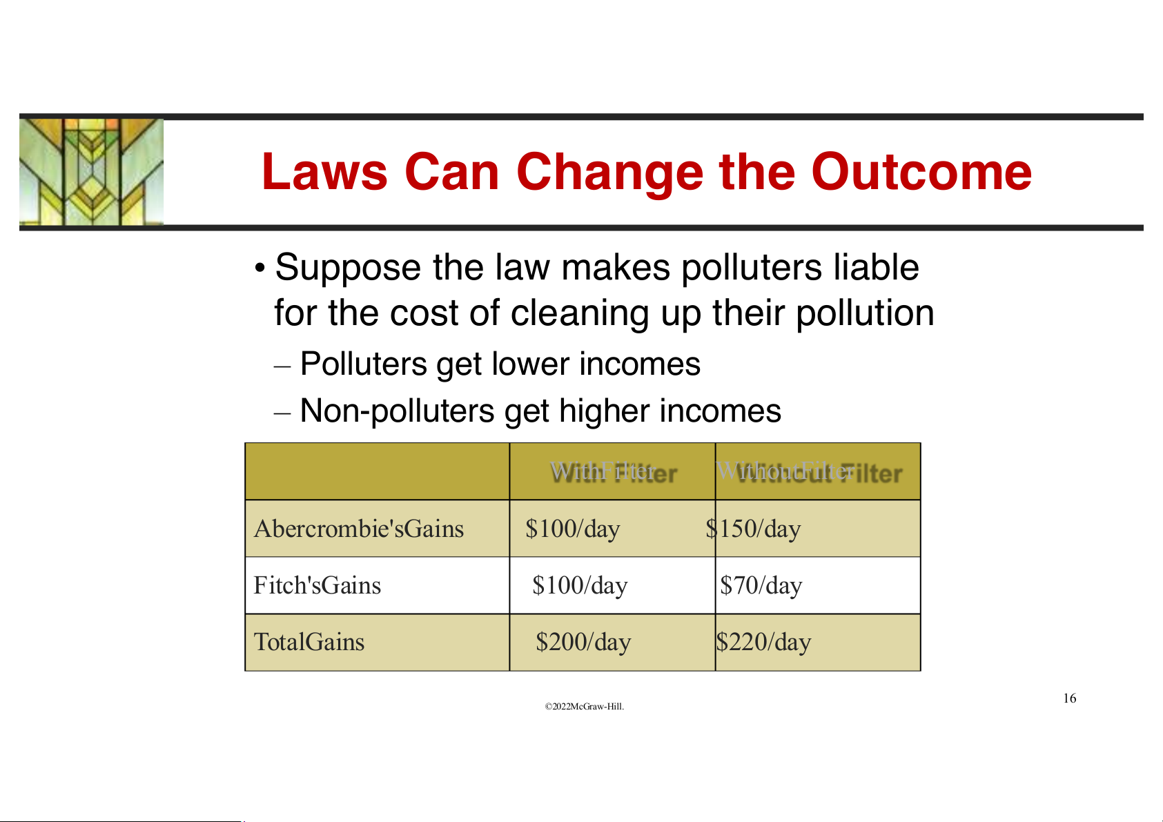 • In this scenario, polluting is the right thing to do With Filter Without Filter Abercrombie's Gains $100 / day $150 / day Fitch's Gains $100 / day $70 / day Total Gains $200 / day $220 / day 15 ©2022 McGraw-Hill.