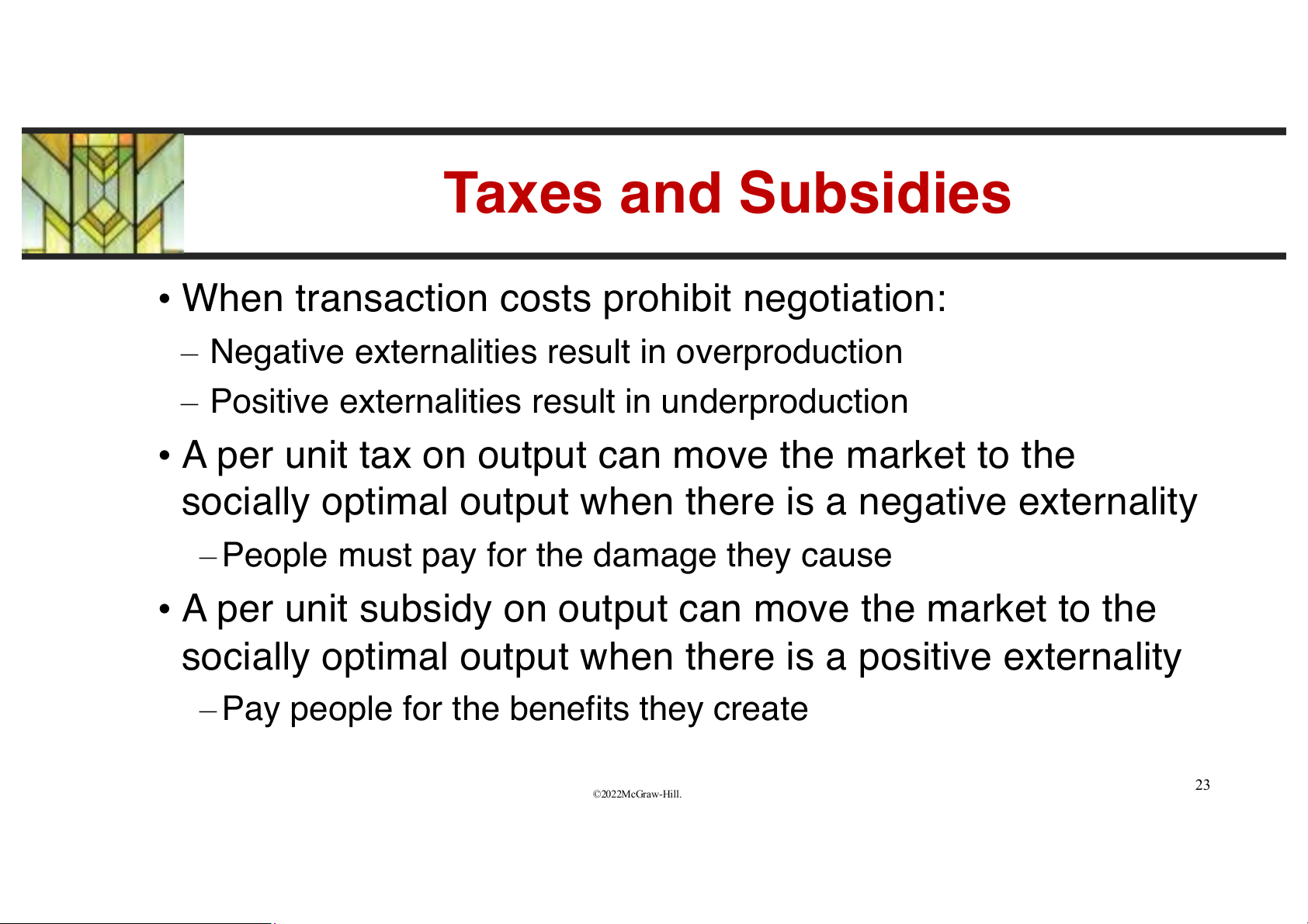 Optimal Amount of Negative Externalities is not Zero Price MC MC = Optimal MB amount of pollution MB Q Quantity of Pollution 22 ©2022 McGraw-Hill. Taxes and Subsidies