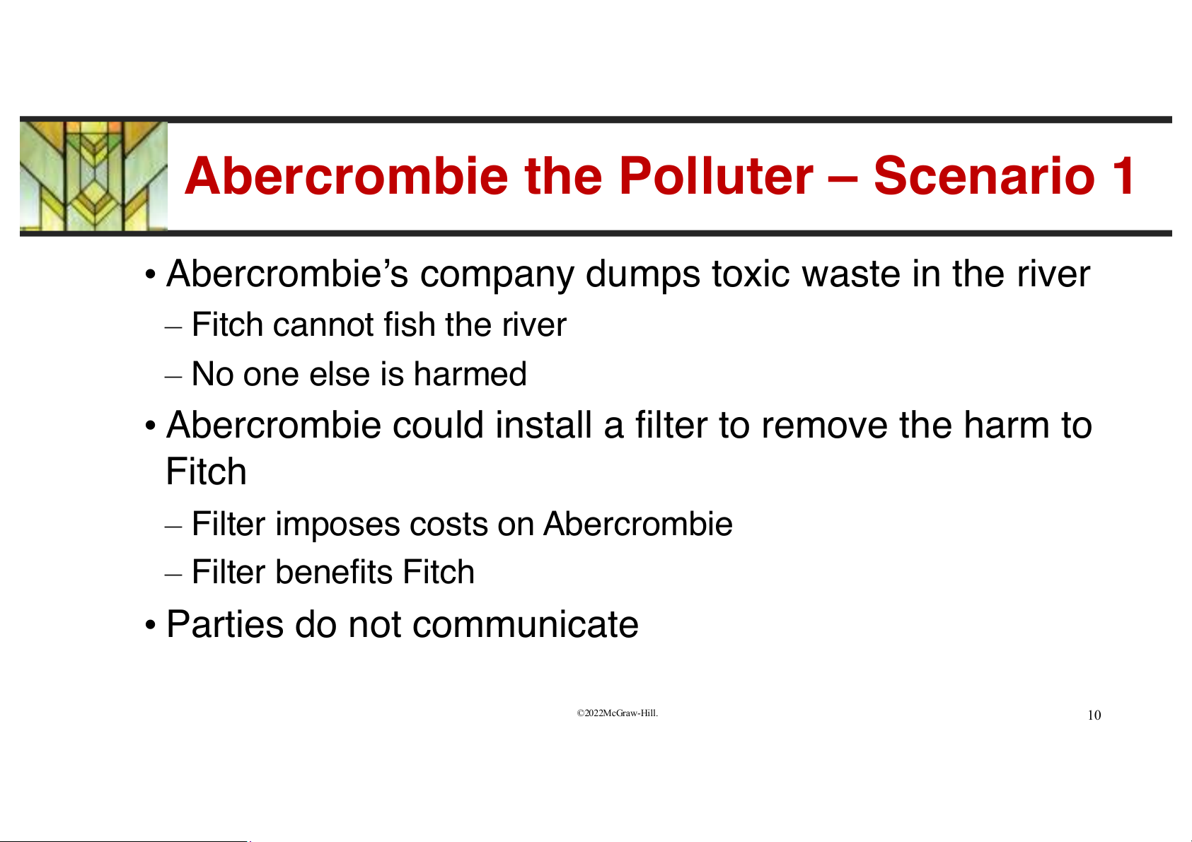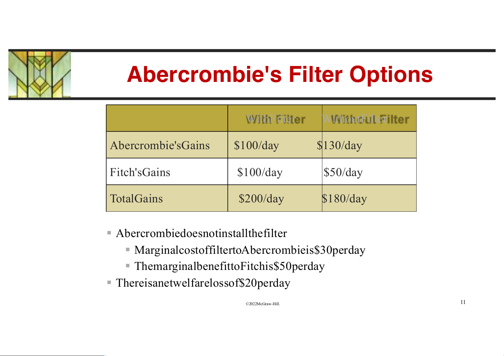– Filter imposes costs on Abercrombie – Filter benefits Fitch • Parties do not communicate ©2022 McGraw-Hill. 10