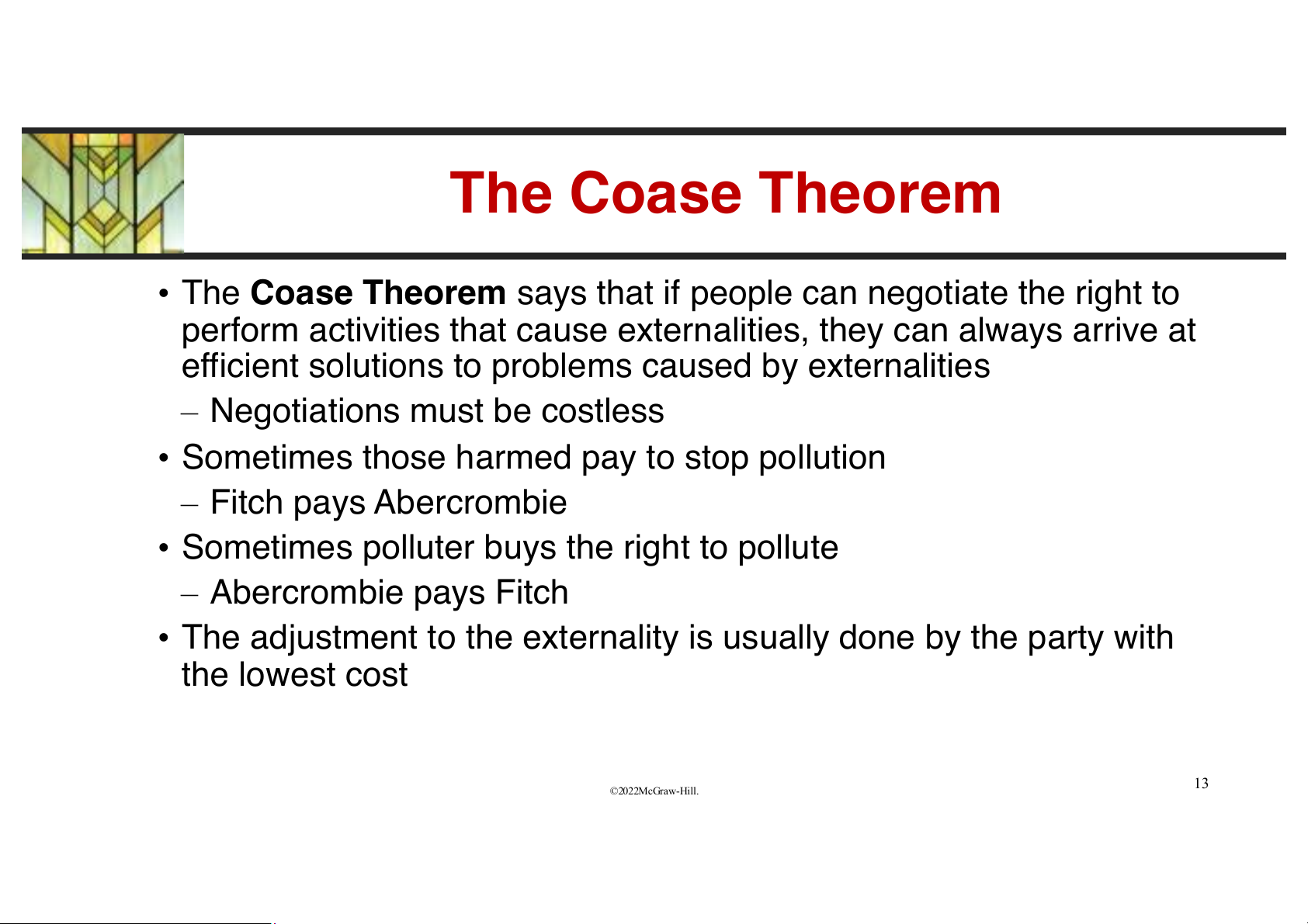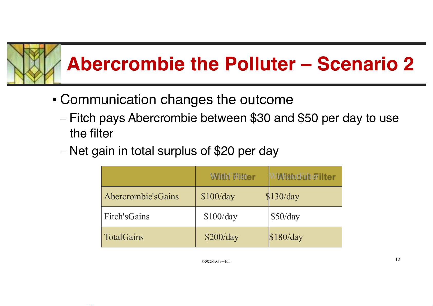 – Net gain in total surplus of $20 per day With Filter Without Filter Abercrombie's Gains $100 / day $130 / day Fitch's Gains $100 / day $50 / day Total Gains $200 / day $180 / day 12 ©2022 McGraw-Hill. The Coase Theorem