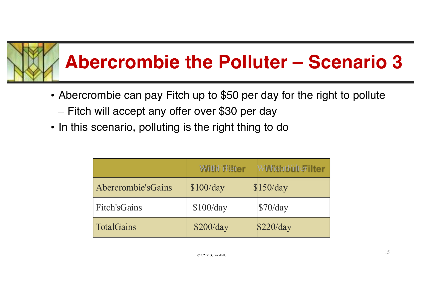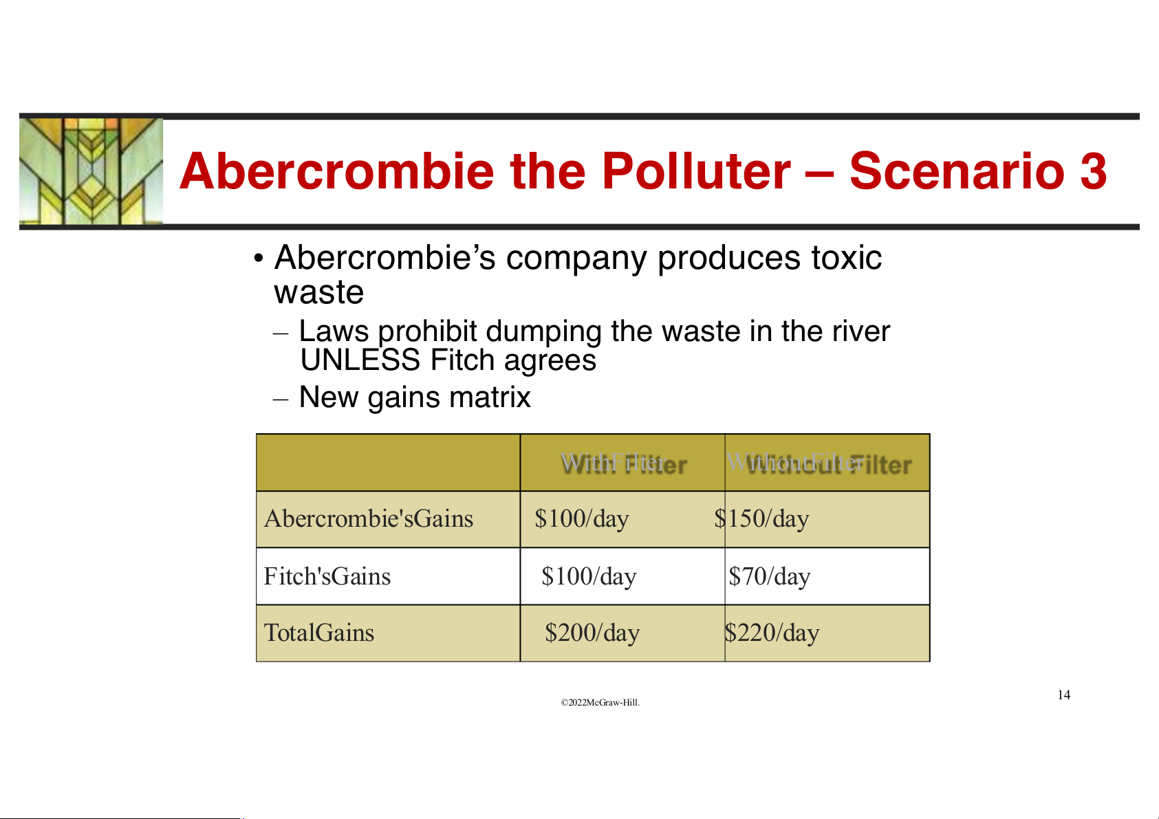 – Laws prohibit dumping the waste in the river UNLESS Fitch agrees – New gains matrix With Filter Without Filter Abercrombie's Gains $100 / day $150 / day Fitch's Gains $100 / day $70 / day Total Gains $200 / day $220 / day 14 ©2022 McGraw-Hill.
