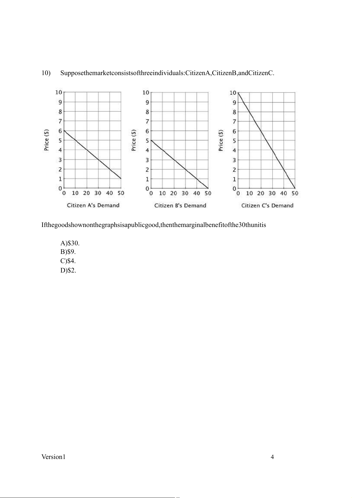 If the good shown on the graphs is a public good, then the marginal benefit of the 30th unit is A) $30. B) $9. C) $4. D) $2. Version 1 4 Answer Key