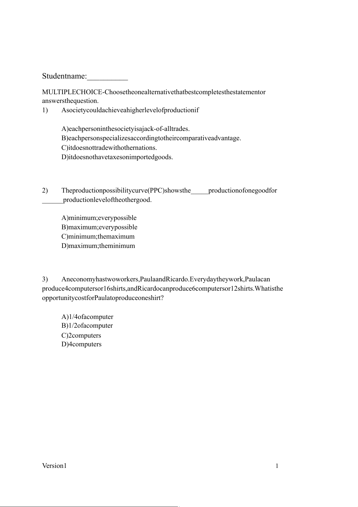 opportunity cost for Paula to produce one shirt? A) 1/4 of a computer B) 1/2 of a computer C) 2 computers D) 4 computers Version 1 1 4)