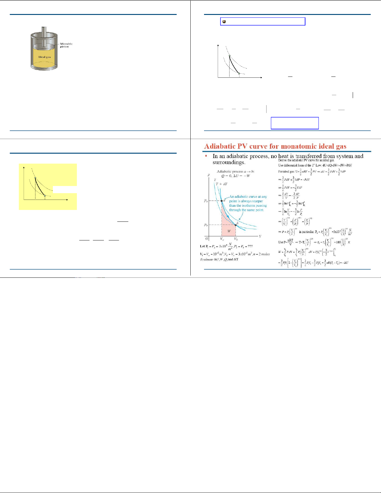 thermal energy ⇒its temperature will V2 V1 V decrease. 2 V 2 V γ V P W = − ( P , V ) T dV = − ∫ 1 1 dV → 1 ∫2 γ V 1 V 1 V ⎛− ⎞ γ 1 ⎜ 1 1 ⎟ = V P1 1 ⎜ γ −1 γ −1 ⎟ γ −1 ⎝V V 2 1 ⎠