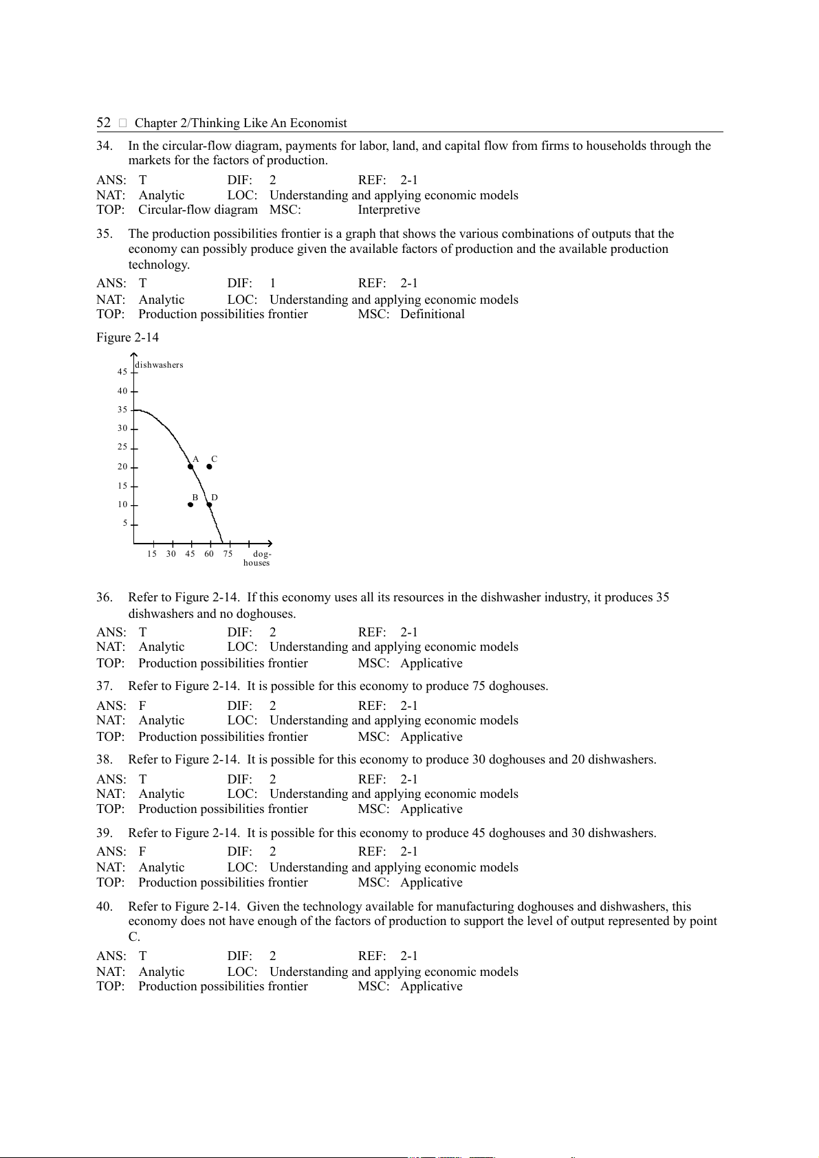 Refer to Figure 2-14. If this economy uses all its resources in the dishwasher industry, it produces 35 dishwashers and no doghouses. ANS: T DIF: 2 REF: 2-1 NAT: Analytic