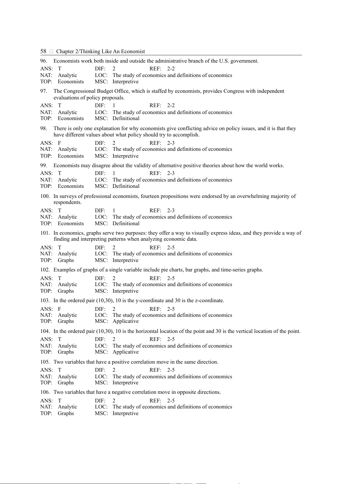 Economists use one standard set of assumptions to answer all economic questions. ANS: F DIF: 2 REF: 2-1 NAT: Analytic