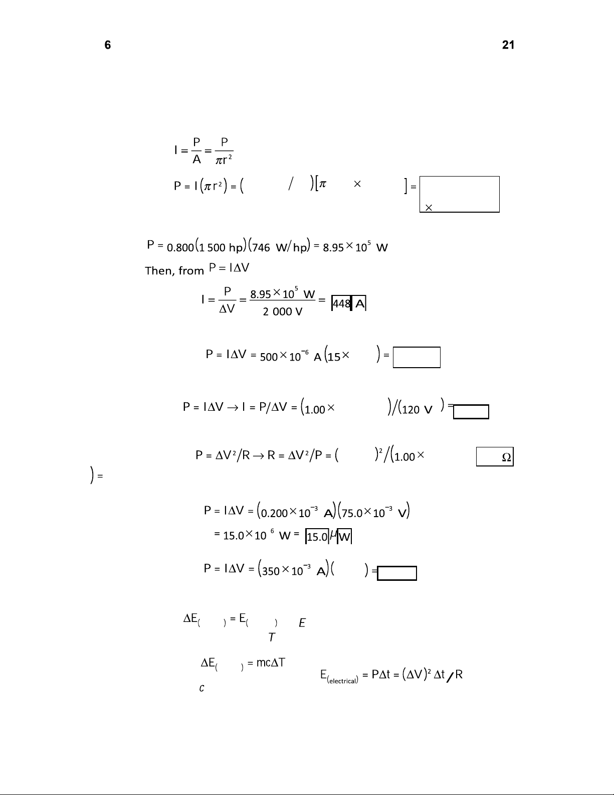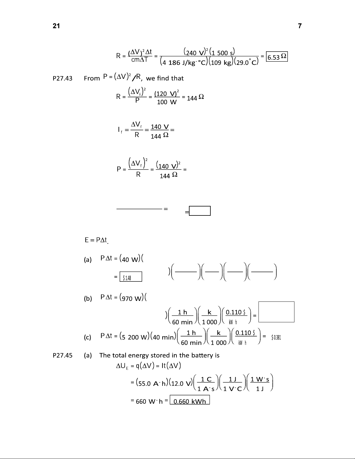 compared to all human energy conversions. *P27.37 , P27.38 From Equation 27.21, 103 V 7.50 W P27.39 (a) From Equation 27.21, 103 W 8.33 A (b) From Equation 27.23, 120 V 103 W 14.4 P27.40 From Equation 27.21, P27.41 From Equation 27.21, 6.00 V 2.10 W P27.42