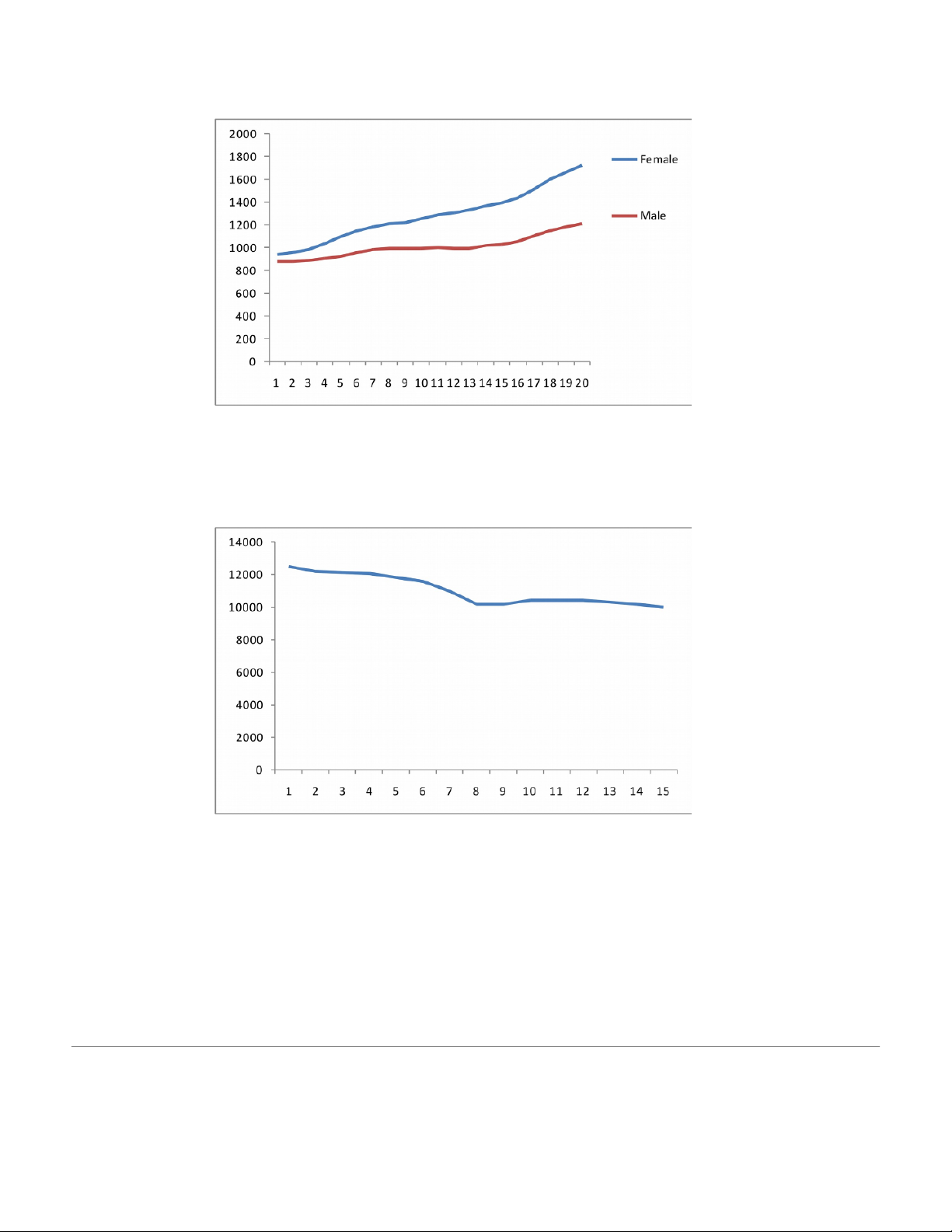 The numbers of females and males are both increasing with the number of females increasing faster. 3.33