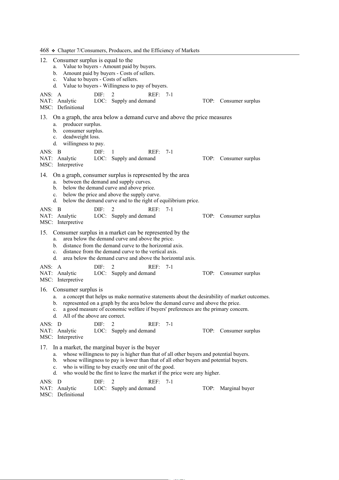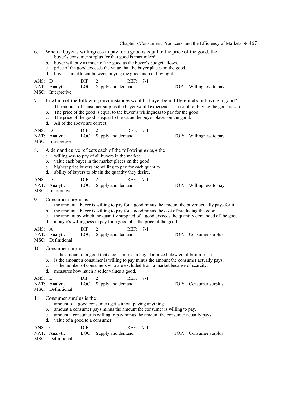ability of buyers to obtain the quantity they desire. ANS: D DIF: 2 REF: 7-1 NAT: Analytic LOC: Supply and demand TOP: Willingness to pay MSC: Interpretive 9. Consumer surplus is a.