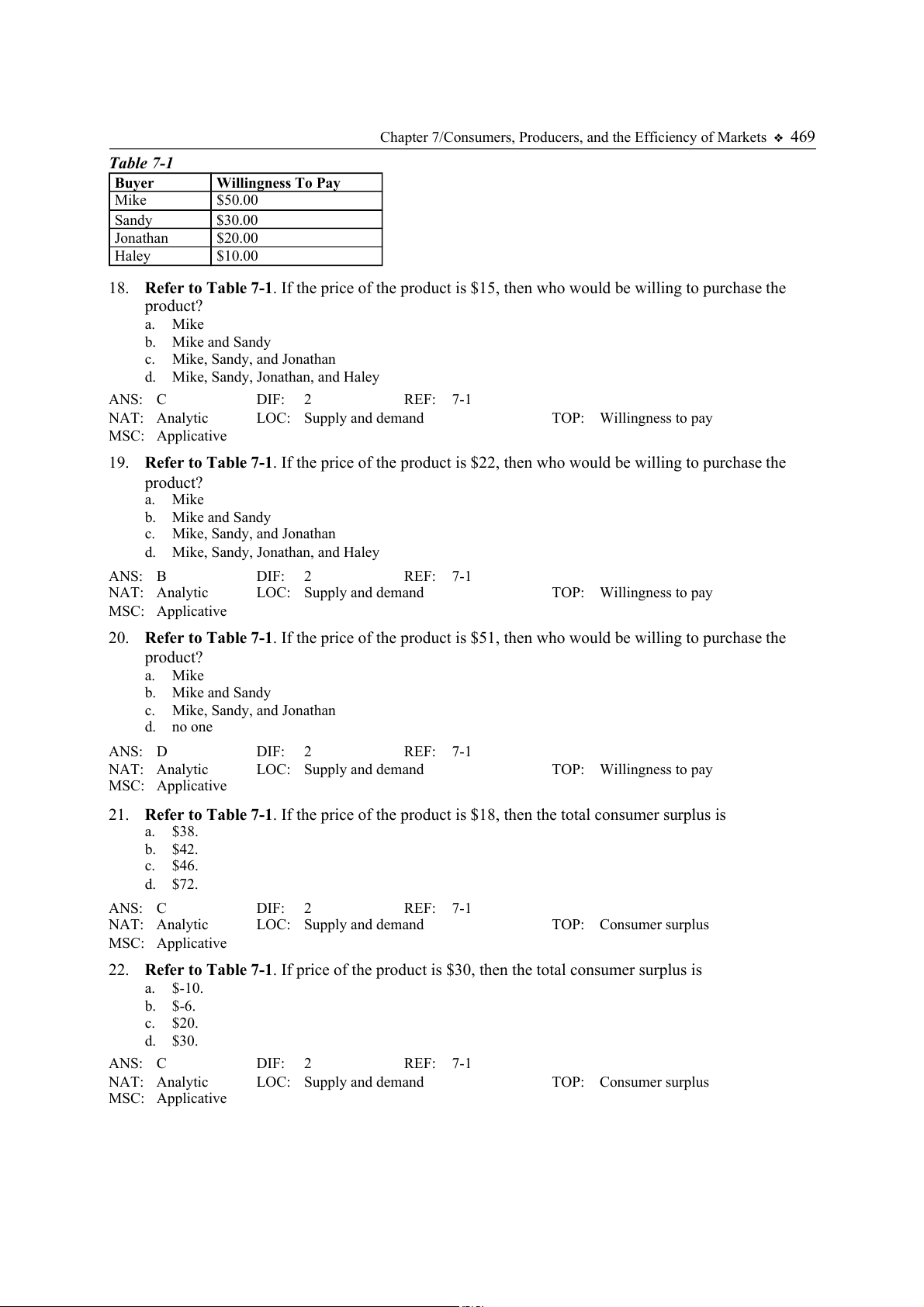 20. Refer to Table 7-1. If the price of the product is $51, then who would be willing to purchase the product? a. Mike b. Mike and Sandy c. Mike, Sandy, and Jonathan d. no one ANS: D DIF: 2 REF: 7-1 NAT: Analytic LOC: Supply and demand TOP: Willingness to pay MSC: Applicative