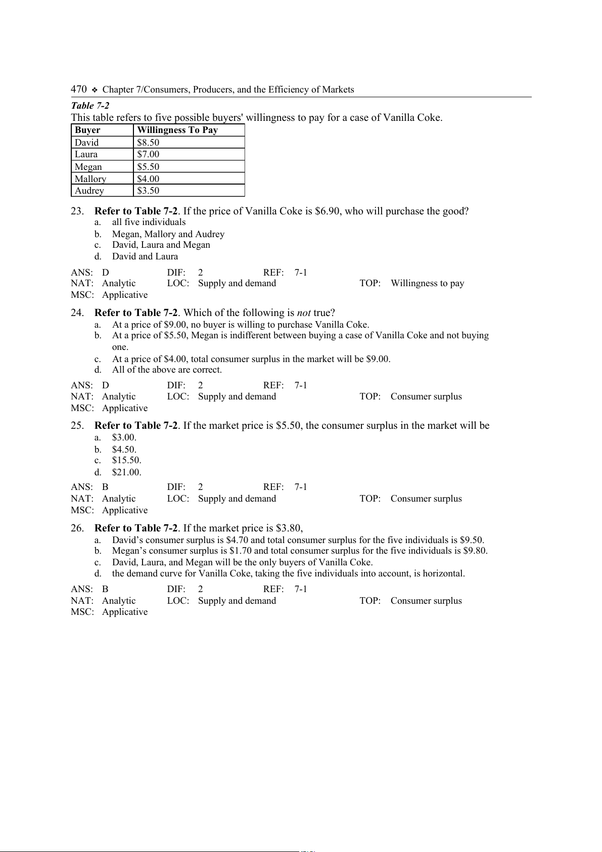 23. Refer to Table 7-2. If the price of Vanilla Coke is $6.90, who will purchase the good? a. all five individuals b. Megan, Mallory and Audrey c. David, Laura and Megan d. David and Laura ANS: D DIF: 2 REF: 7-1 NAT: Analytic LOC: Supply and demand TOP: Willingness to pay MSC: Applicative