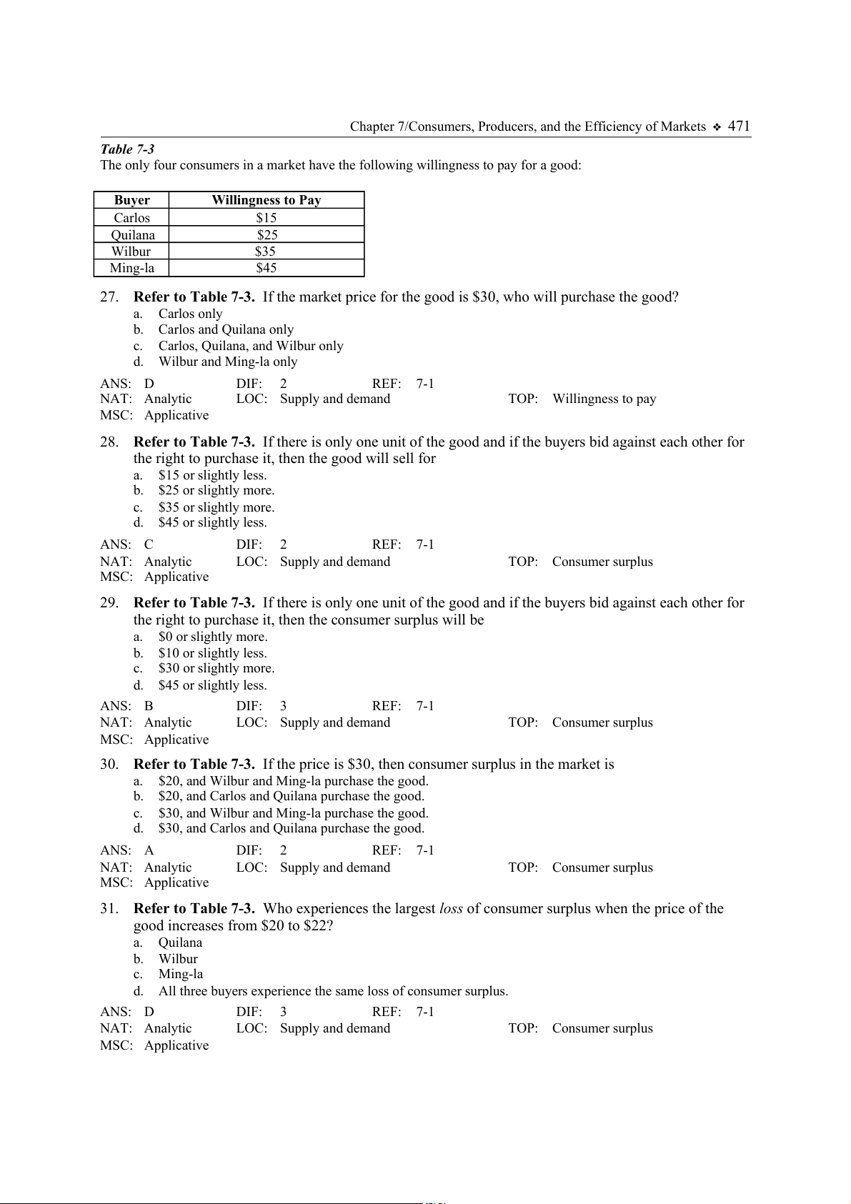 27. Refer to Table 7-3. If the market price for the good is $30, who will purchase the good? a. Carlos only b. Carlos and Quilana only c.