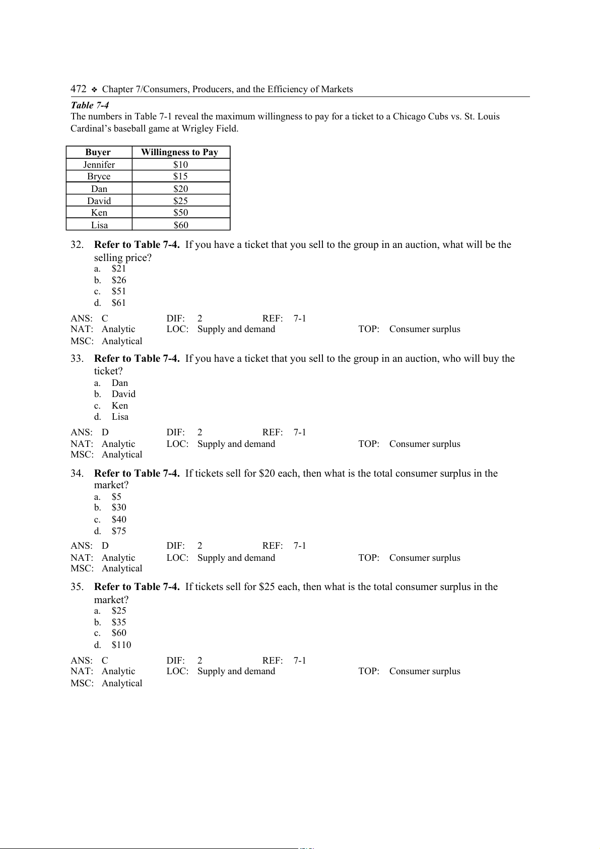 32. Refer to Table 7-4. If you have a ticket that you sell to the group in an auction, what will be the selling price? a. $21 b. $26 c. $51 d. $61 ANS: C DIF: 2 REF: 7-1 NAT: Analytic LOC: Supply and demand TOP: Consumer surplus MSC: Analytical