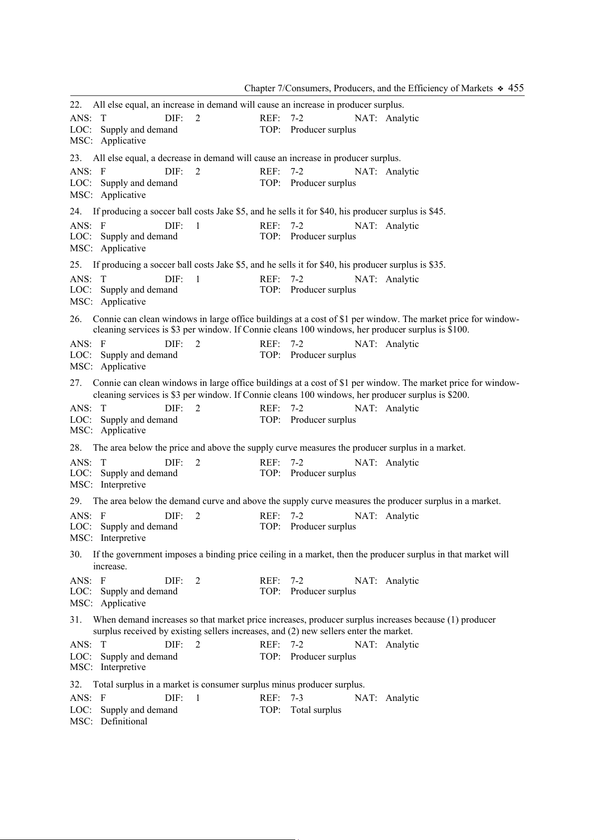 surplus received by existing sellers increases, and (2) new sellers enter the market. ANS: T DIF: 2 REF: 7-2 NAT: Analytic LOC: Supply and demand TOP: Producer surplus MSC: Interpretive 32.