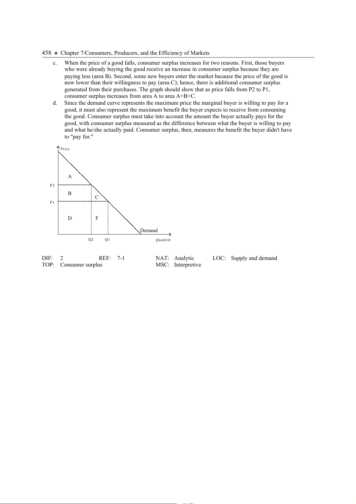 and what he/she actually paid. Consumer surplus, then, measures the benefit the buyer didn't have to "pay for." Price A P 2 B C P 1 D F Demand Q2 Q1 Quanti ty DIF: 2 REF: 7-1 NAT: Analytic LOC: Supply and demand TOP: Consumer surplus MSC: Interpretive