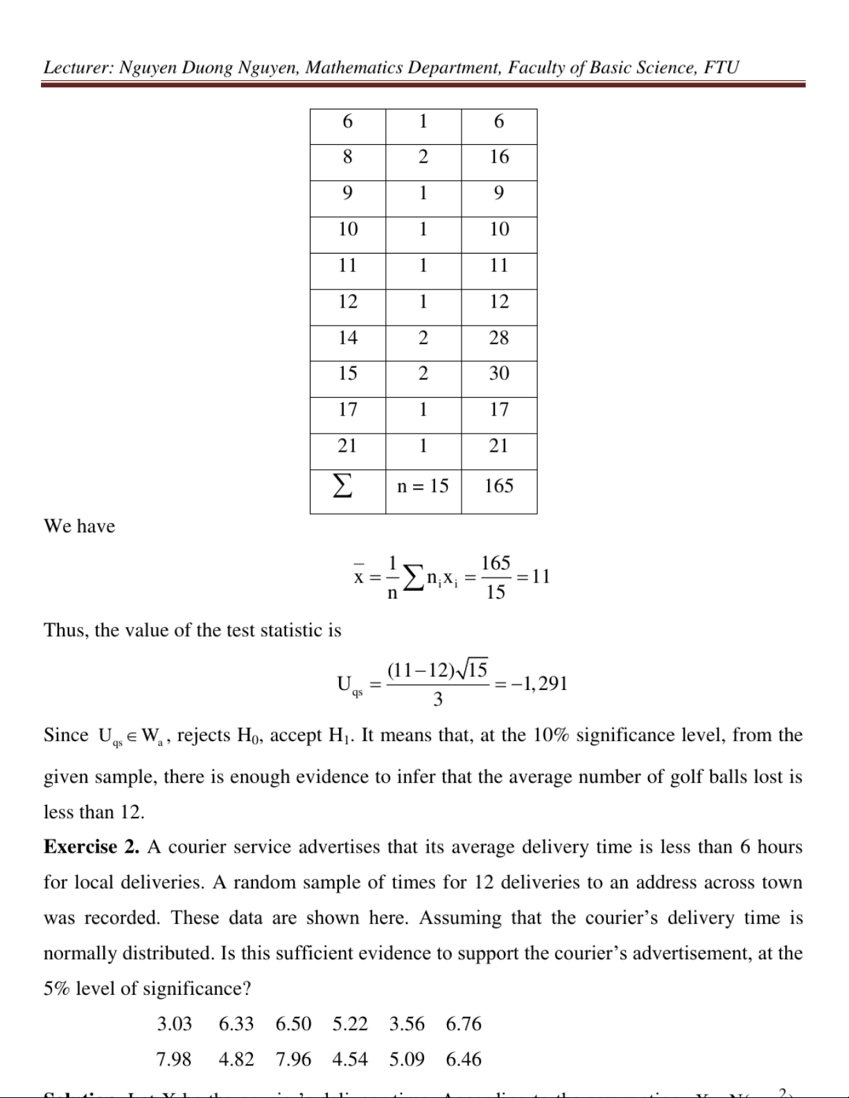 Exercise 1. The club professional at a difficult public courseboasts that his course is so tough that the average golfer loses a dozen or more golf balls during a round of golf. Tài liệu giúp bạn tham khảo, ôn tập và đạt kết quả cao. Mời đọc đón xem!