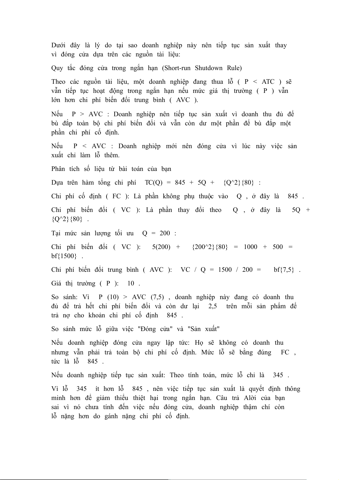 nhưng vẫn phải trả toàn bộ chi phí cố định. Mức lỗ sẽ bằng đúng FC , tức là lỗ 845 .