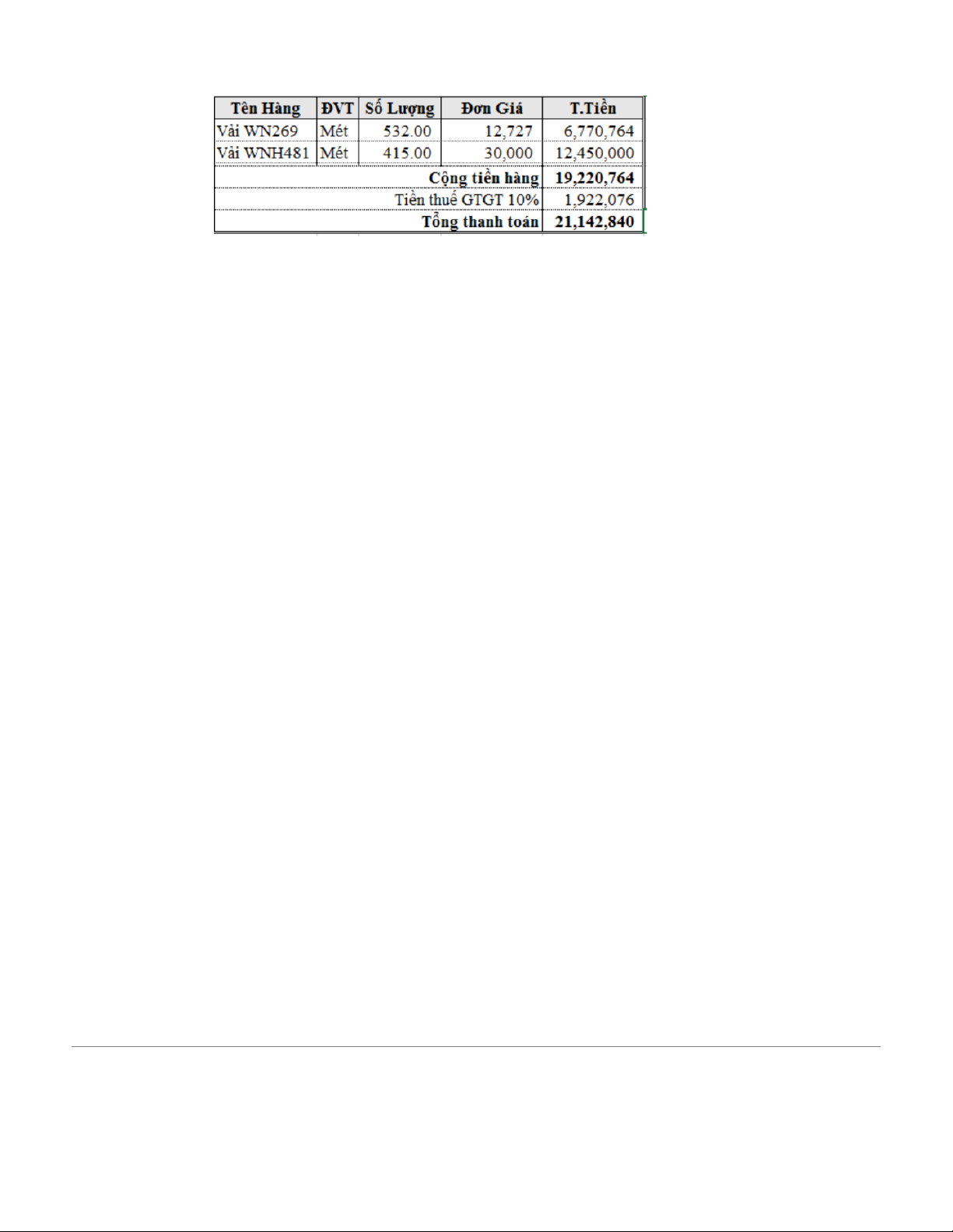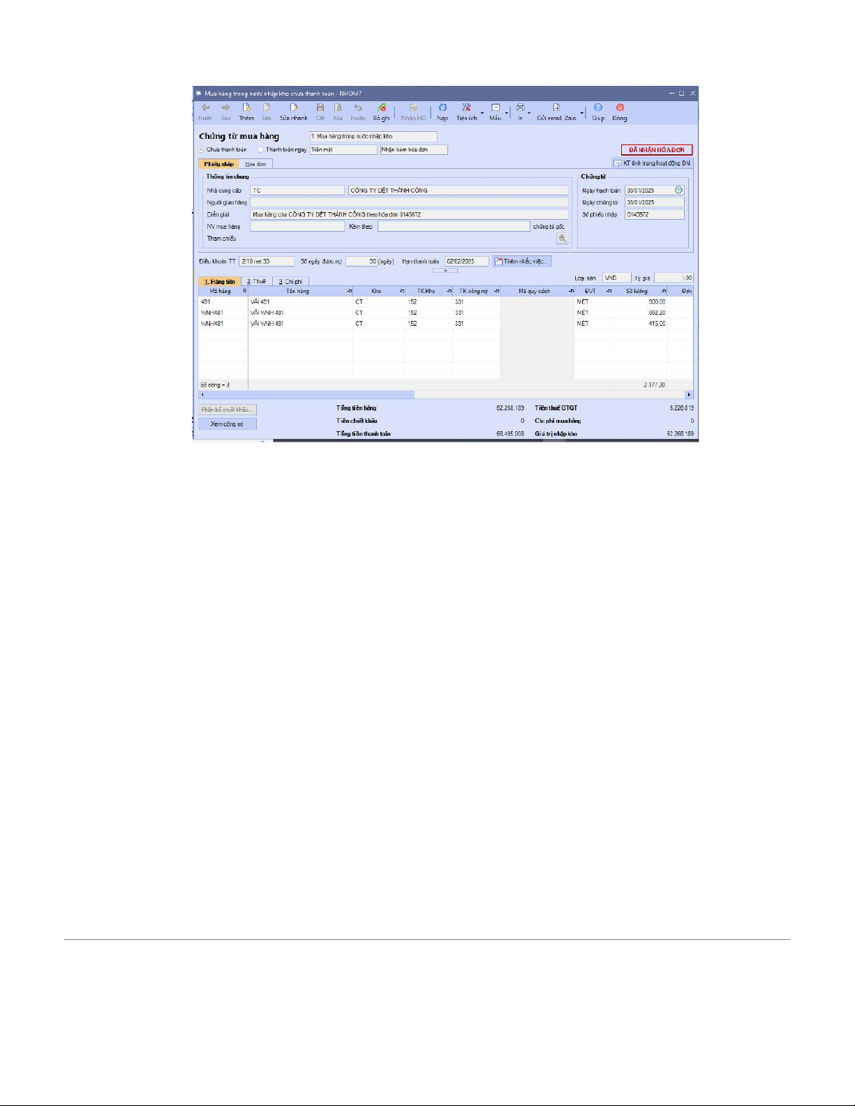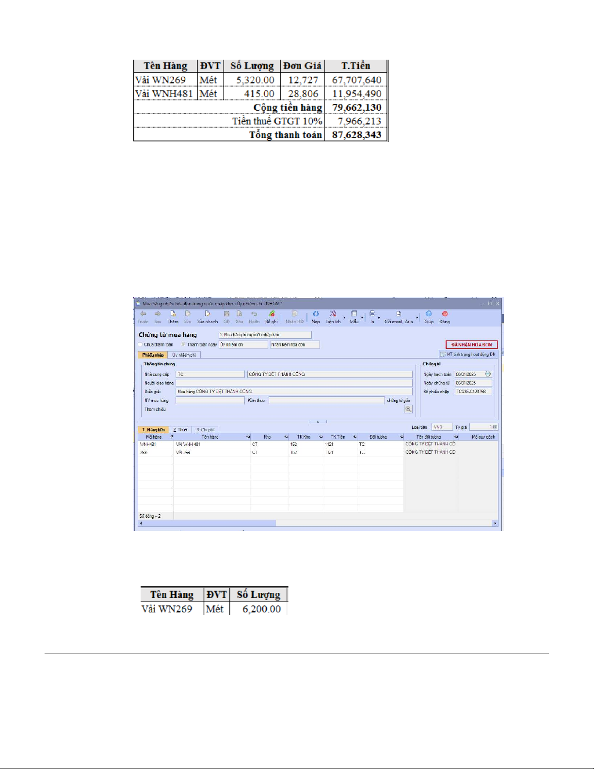 1. Ngày 03/01/2025, mua vải của Công Cảm ơn Dệt Tôi Công, chi tiết bạn đơn NHOM0X_19C-0145672 như sau: