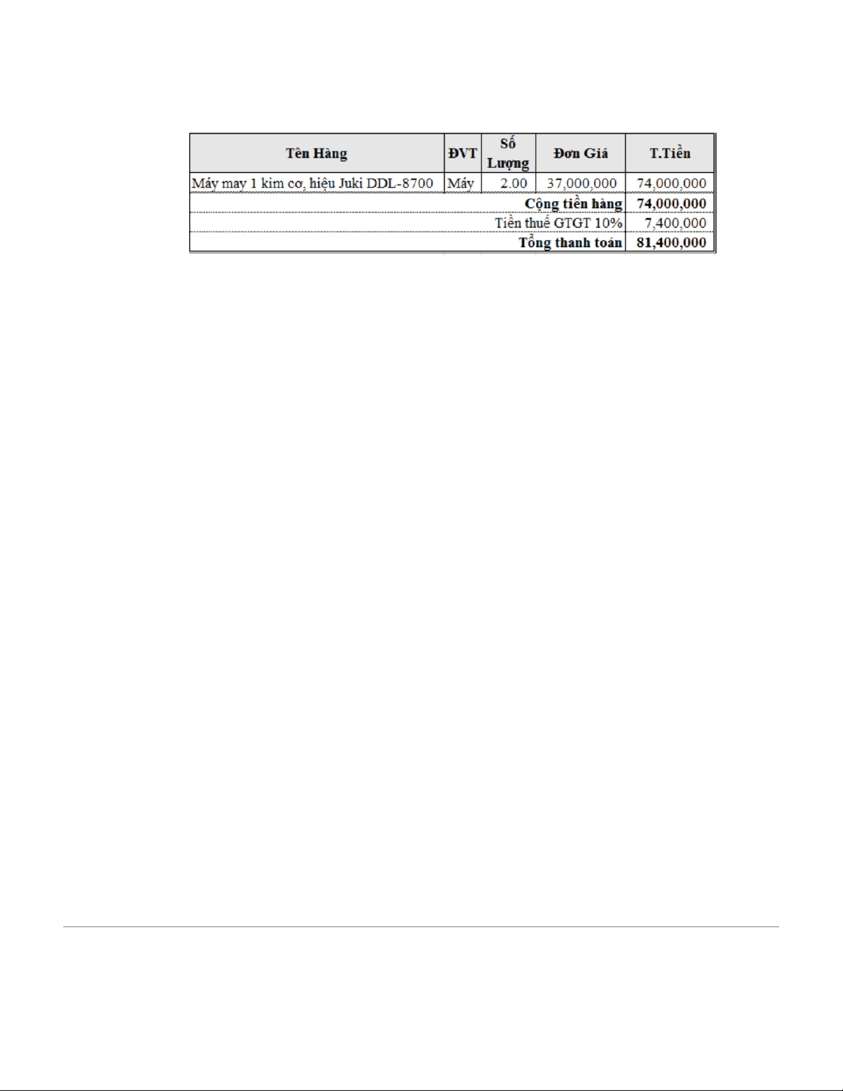 Tên: Máy may 1 kim cơ, hiệu Juki DDl-8700 -> Cất TK chi phí 2112 TK tiền 1121 Nhập số lượng: 2 Đơn giá: 37.000.000 Thành tiền: 74.000.000 - % thuế GTGT10% T1 thu: 7.400.000 - Hóa đơn