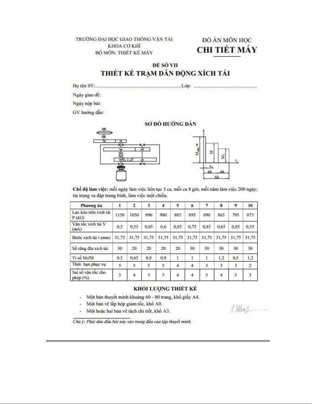 1/ Các thông số cho trước :    Lực kéo trên xích tải  P = 980(KG)  Vân tốc xích tải(m/s):  V= 0,6 (m/s)  Bước xích tải (mm) :  t=31,75(mm)  Số răng đĩa xích tải  z = 20   Tỉ số M1/M  M1/M=0,9